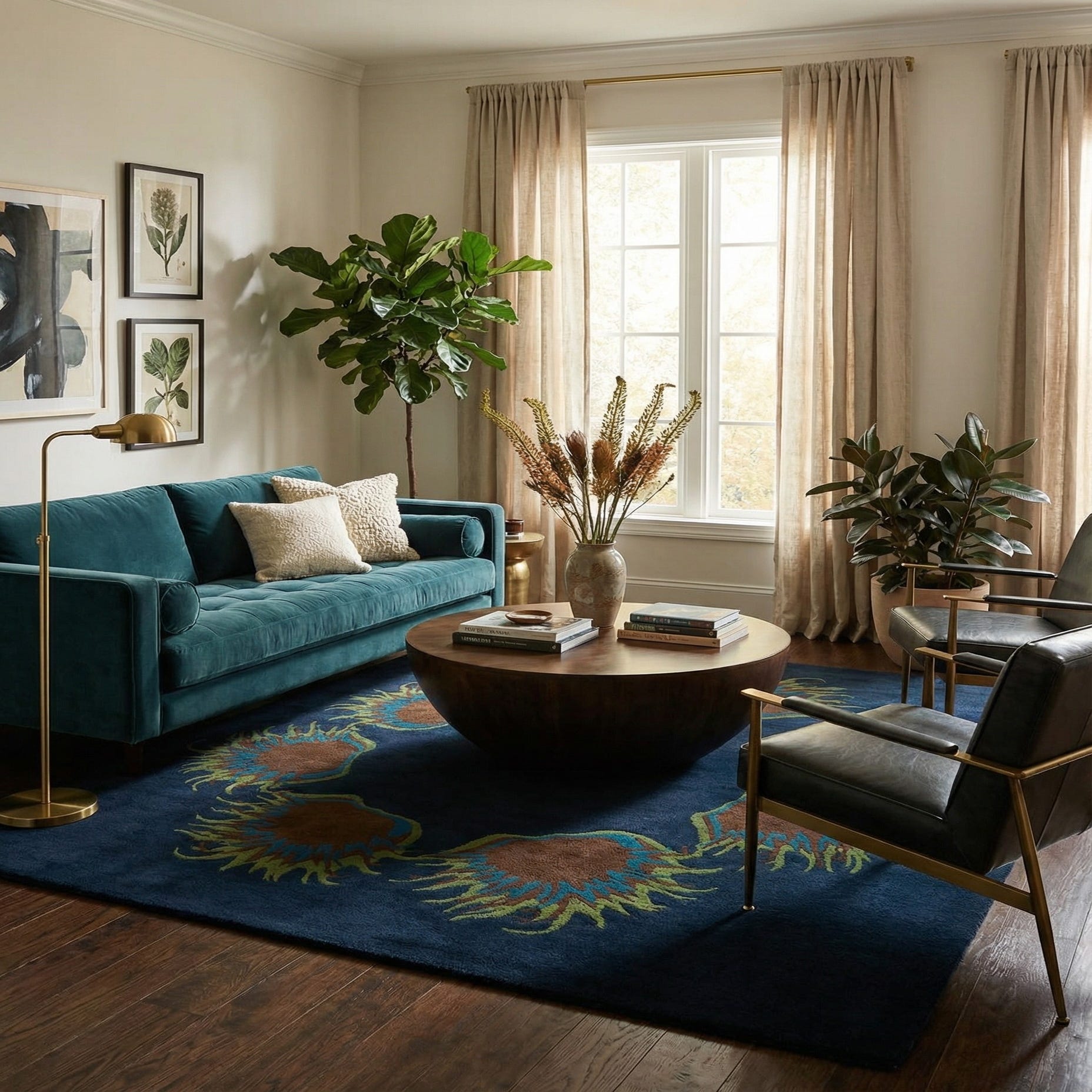Primary color is Navy Blue. Colors in this rug include: Navy Blue, Blue, Brown, Green.