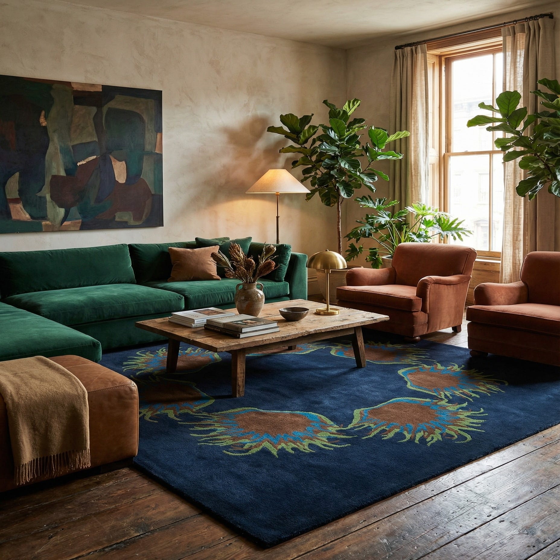 Primary color is Navy Blue. Colors in this rug include: Navy Blue, Blue, Brown, Green.