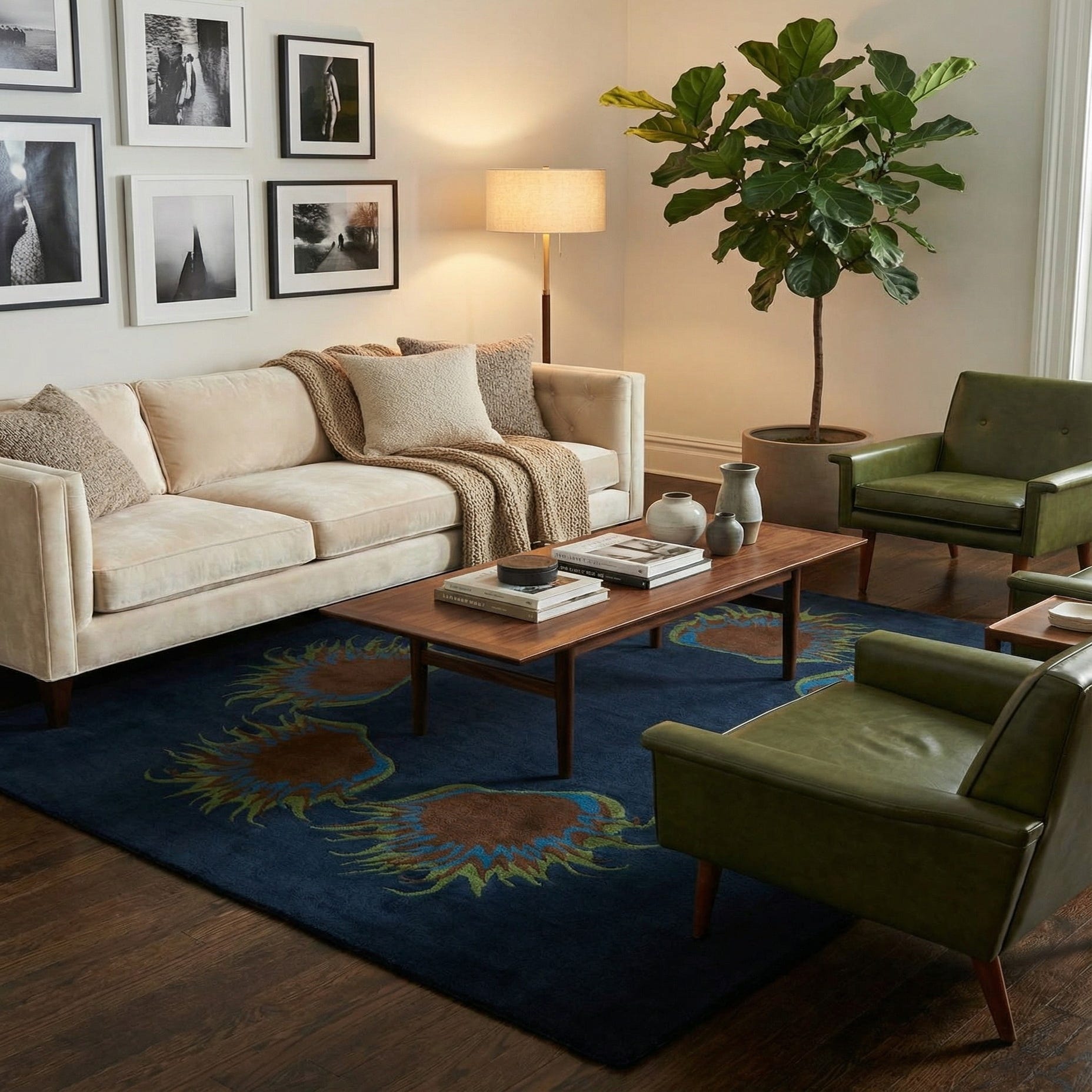 Primary color is Navy Blue. Colors in this rug include: Navy Blue, Blue, Brown, Green.