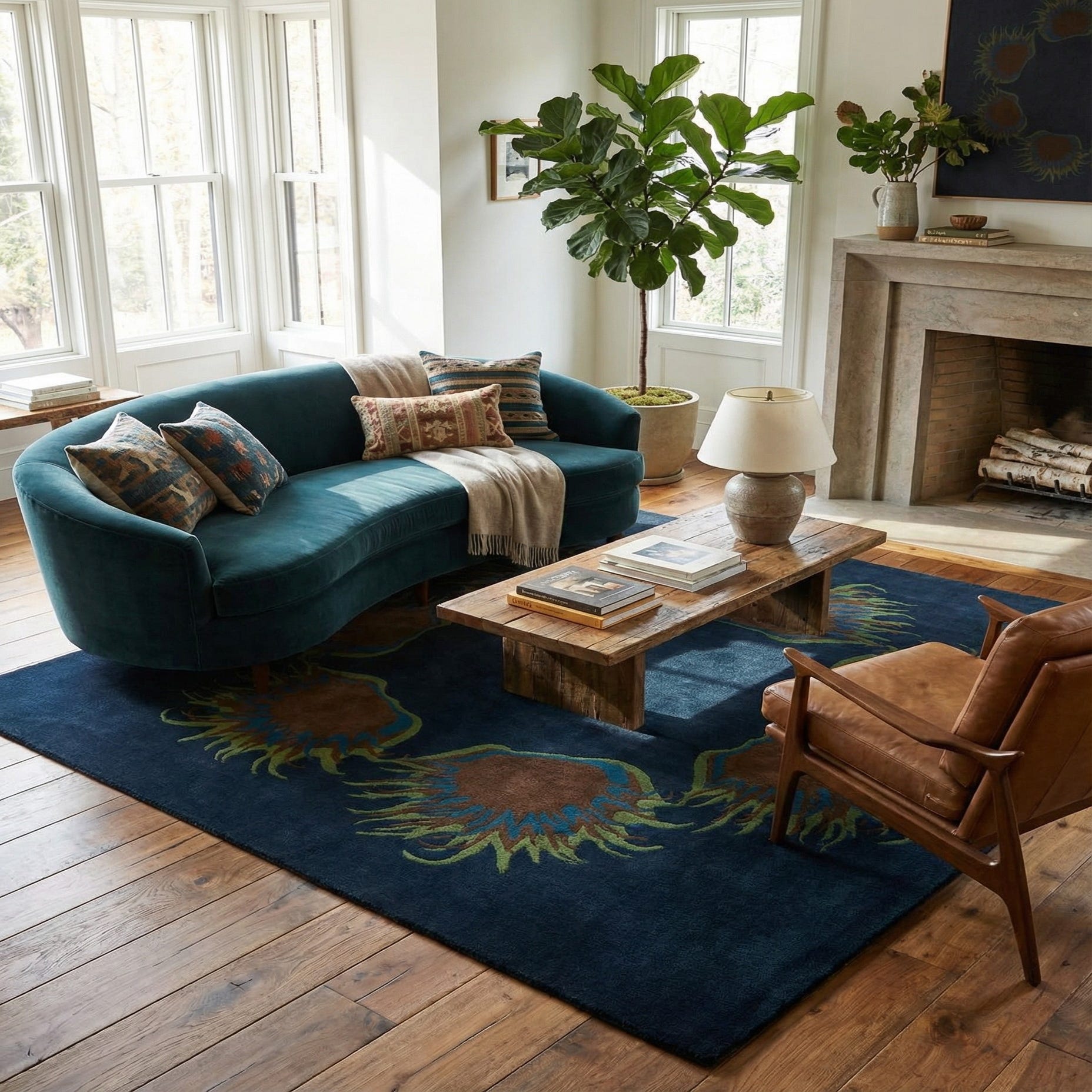 Primary color is Navy Blue. Colors in this rug include: Navy Blue, Blue, Brown, Green.