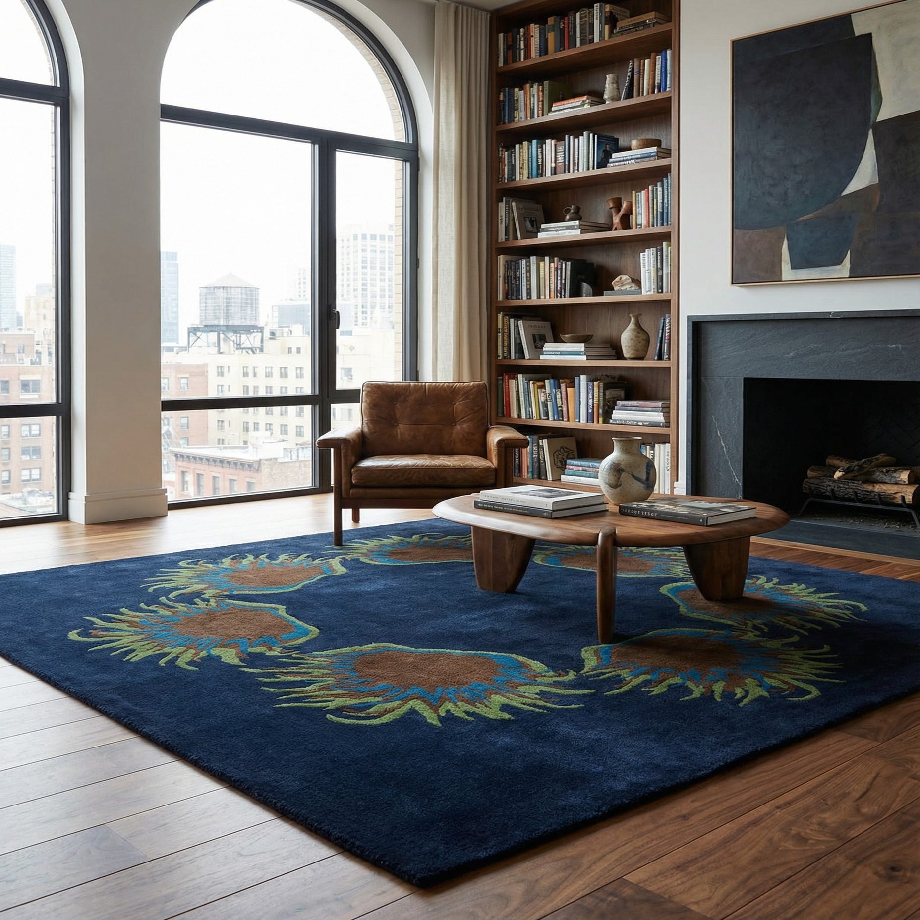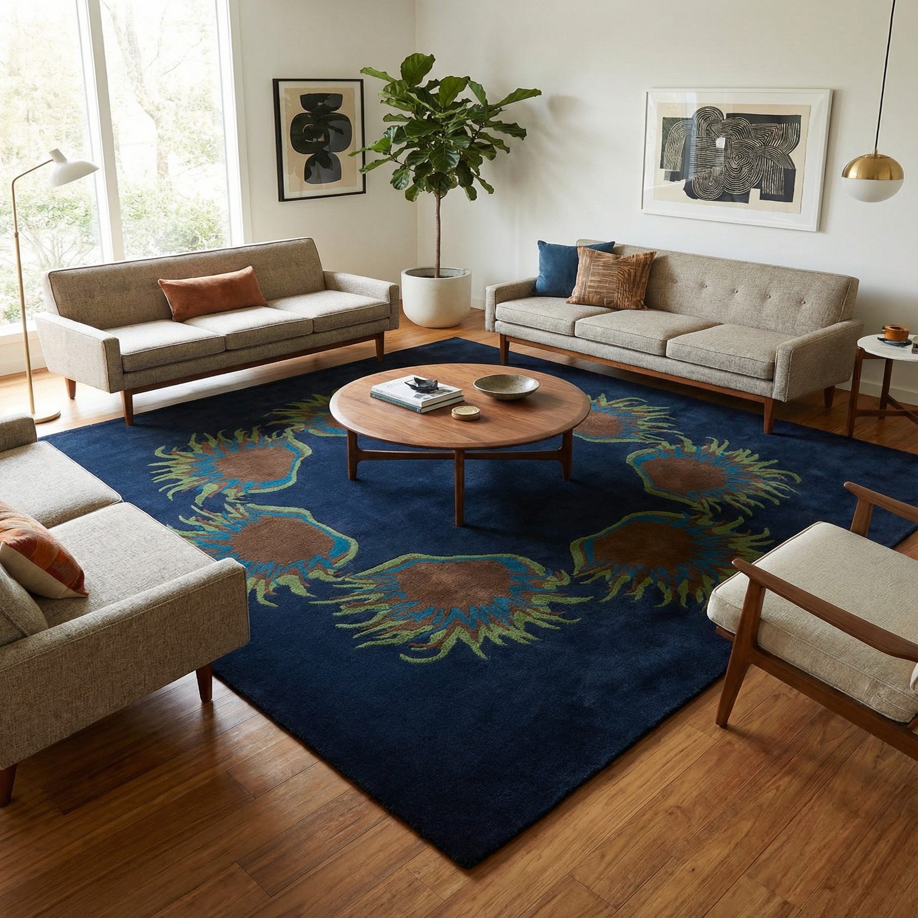 Primary color is Navy Blue. Colors in this rug include: Navy Blue, Blue, Brown, Green.