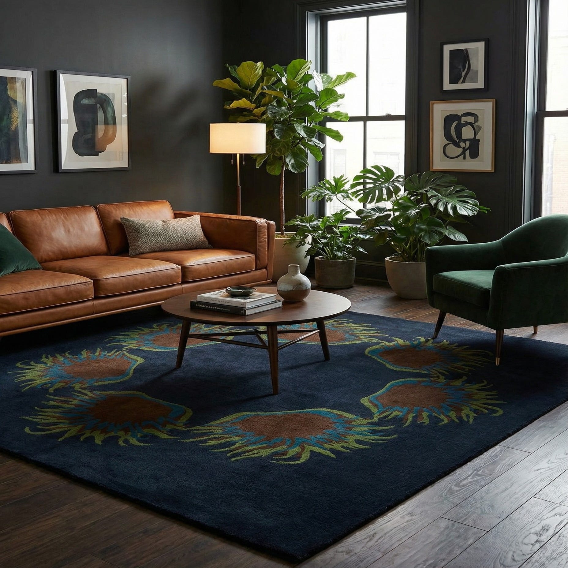 Primary color is Navy Blue. Colors in this rug include: Navy Blue, Blue, Brown, Green.