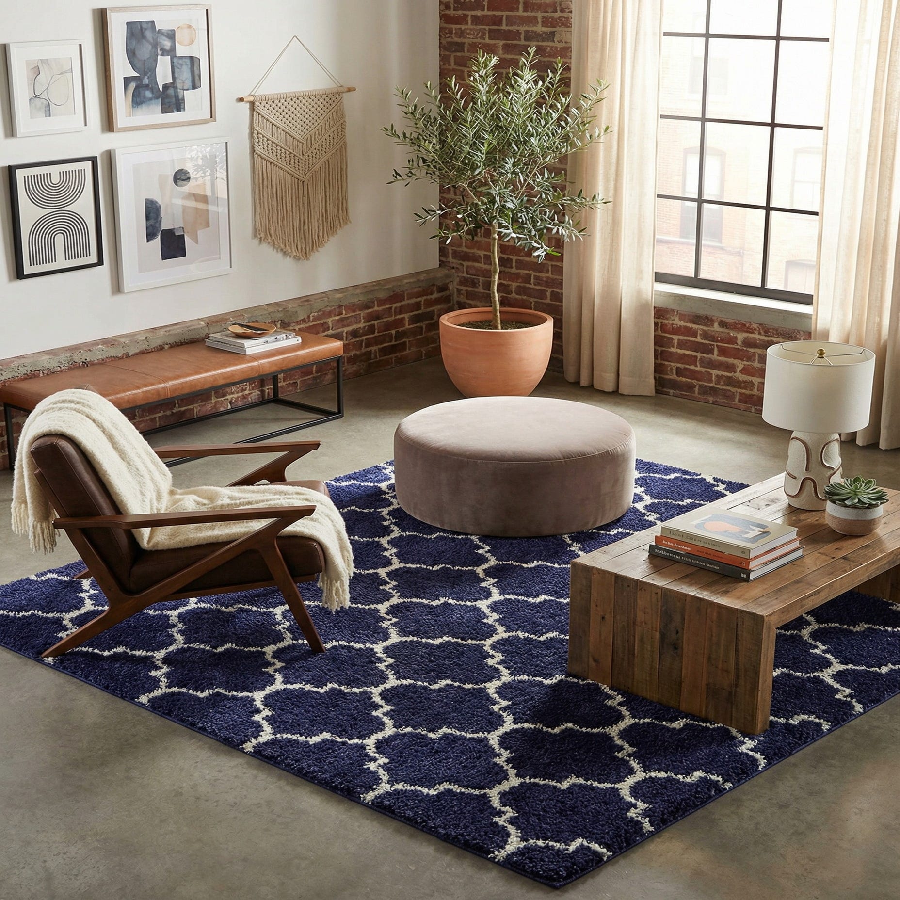 Primary color is Navy Blue. Colors in this rug include: Navy Blue, Ivory.
