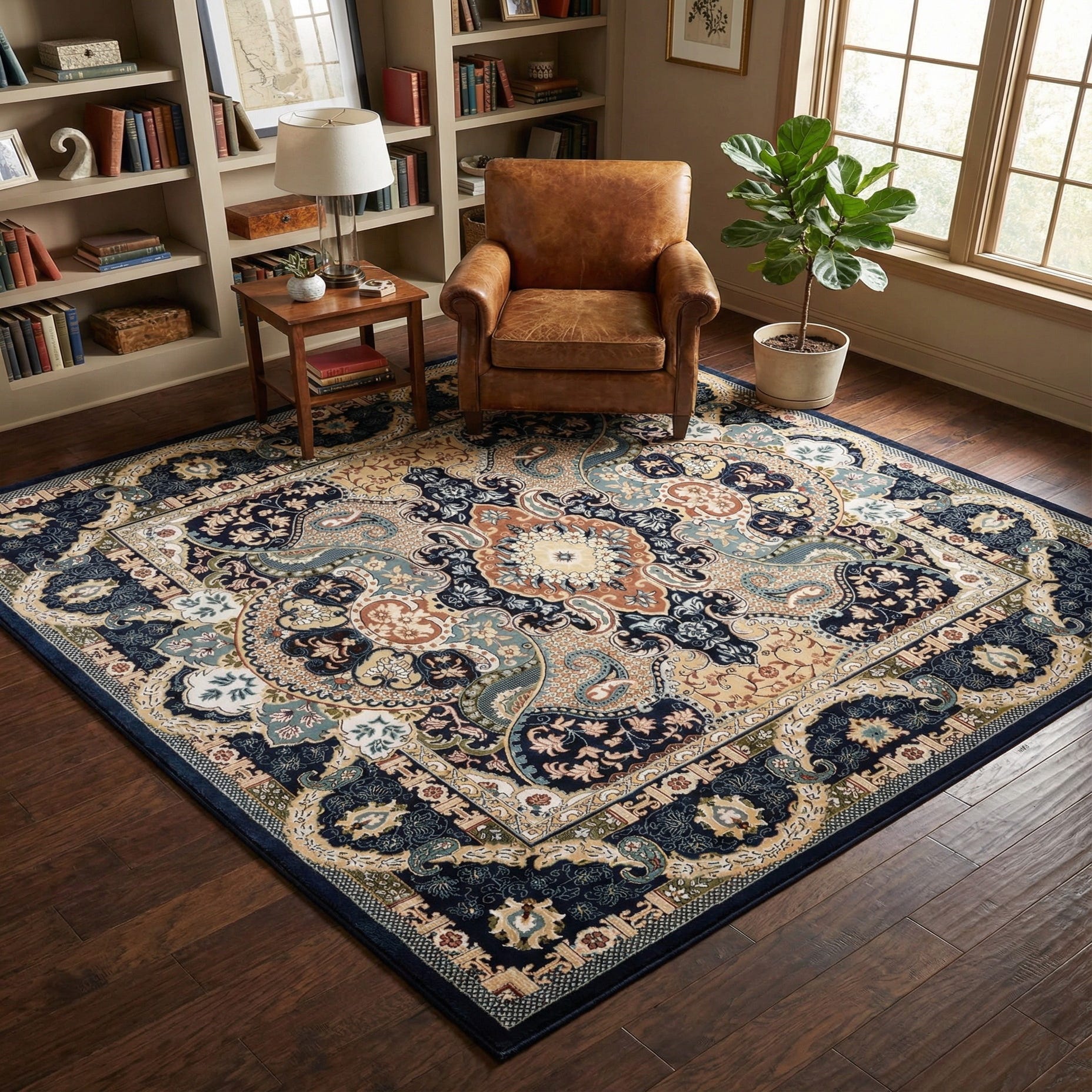 Primary color is Navy Blue. Colors in this rug include: Navy Blue, Blue, Burgundy, Cream, Green, Ivory, Plum Red, Tan.