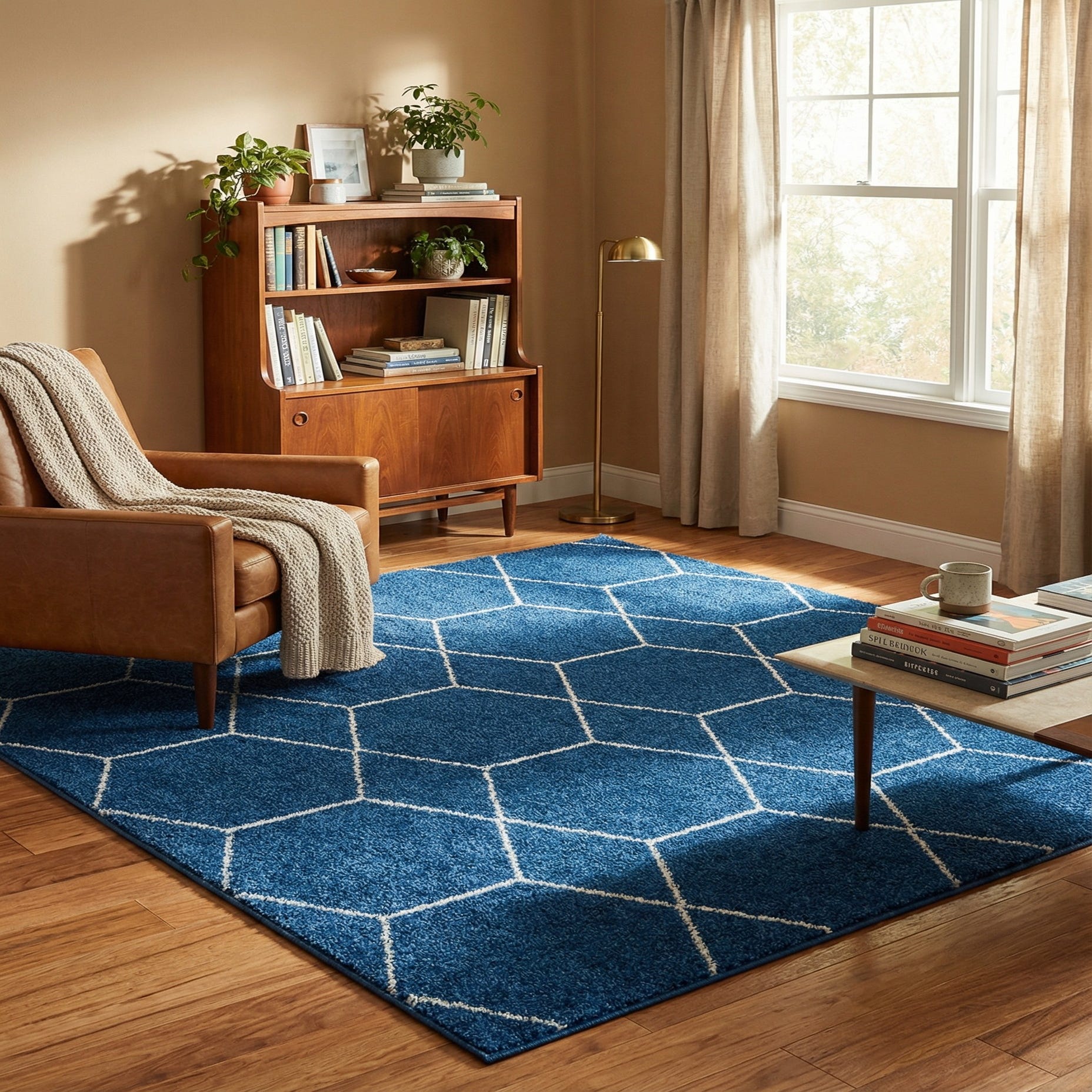 Primary color is Navy Blue. Colors in this rug include: Navy Blue, Ivory.