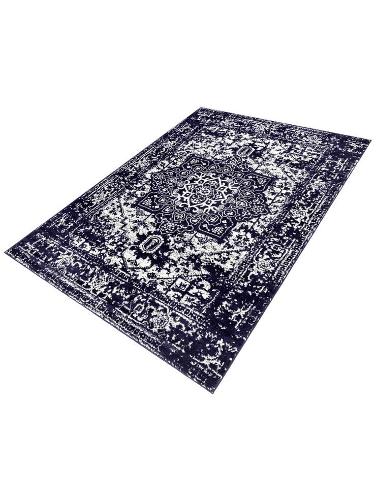Primary color is Navy Blue. Colors in this rug include: Navy Blue, Ivory.