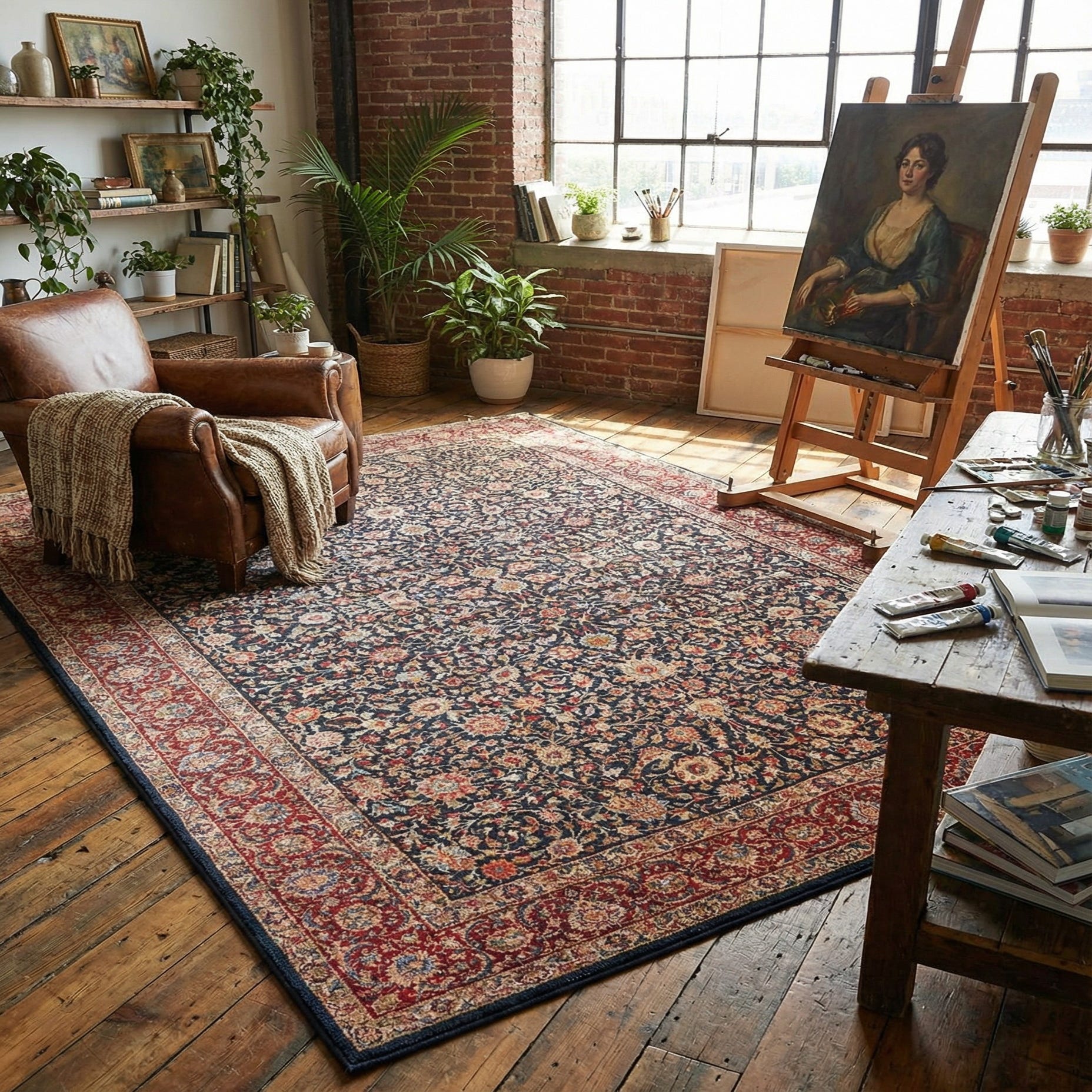Primary color is Navy Blue. Colors in this rug include: Navy Blue, Brown, Ivory, Light Blue, Olive, Peach, Red, Yellow.
