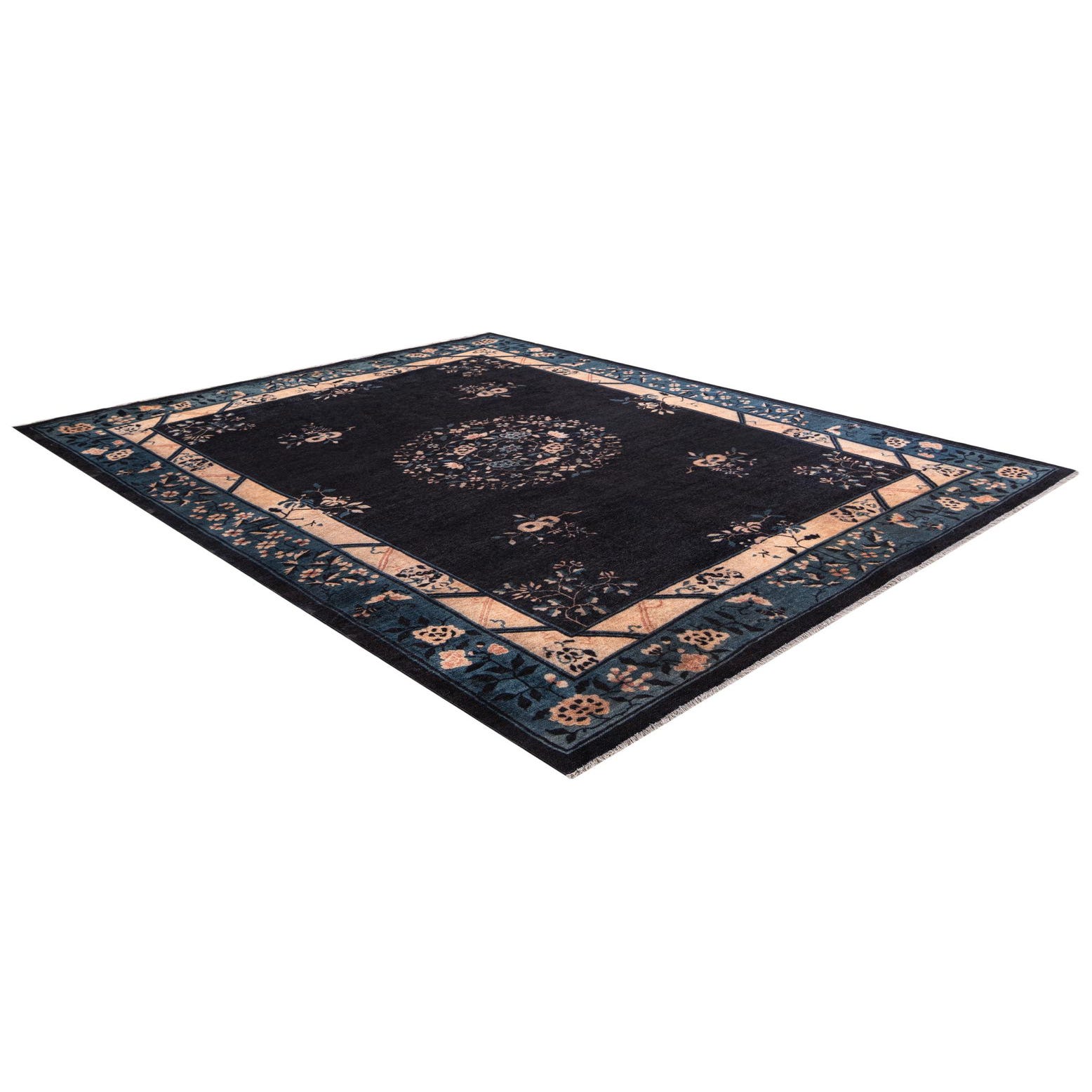 Primary color is Navy Blue. Colors in this rug include: Navy Blue, Ivory, Light Brown, Light Blue.