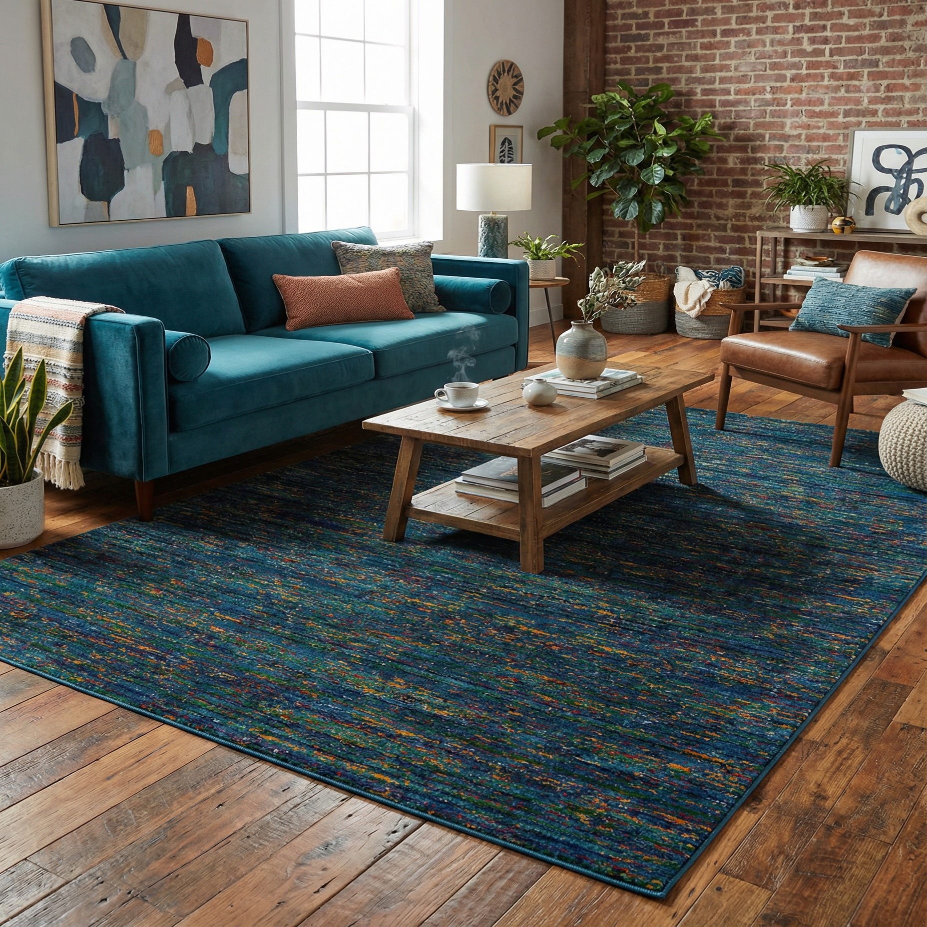 Primary color is Navy Blue. Colors in this rug include: Navy Blue, Blue, Green, Red, Yellow, Orange.