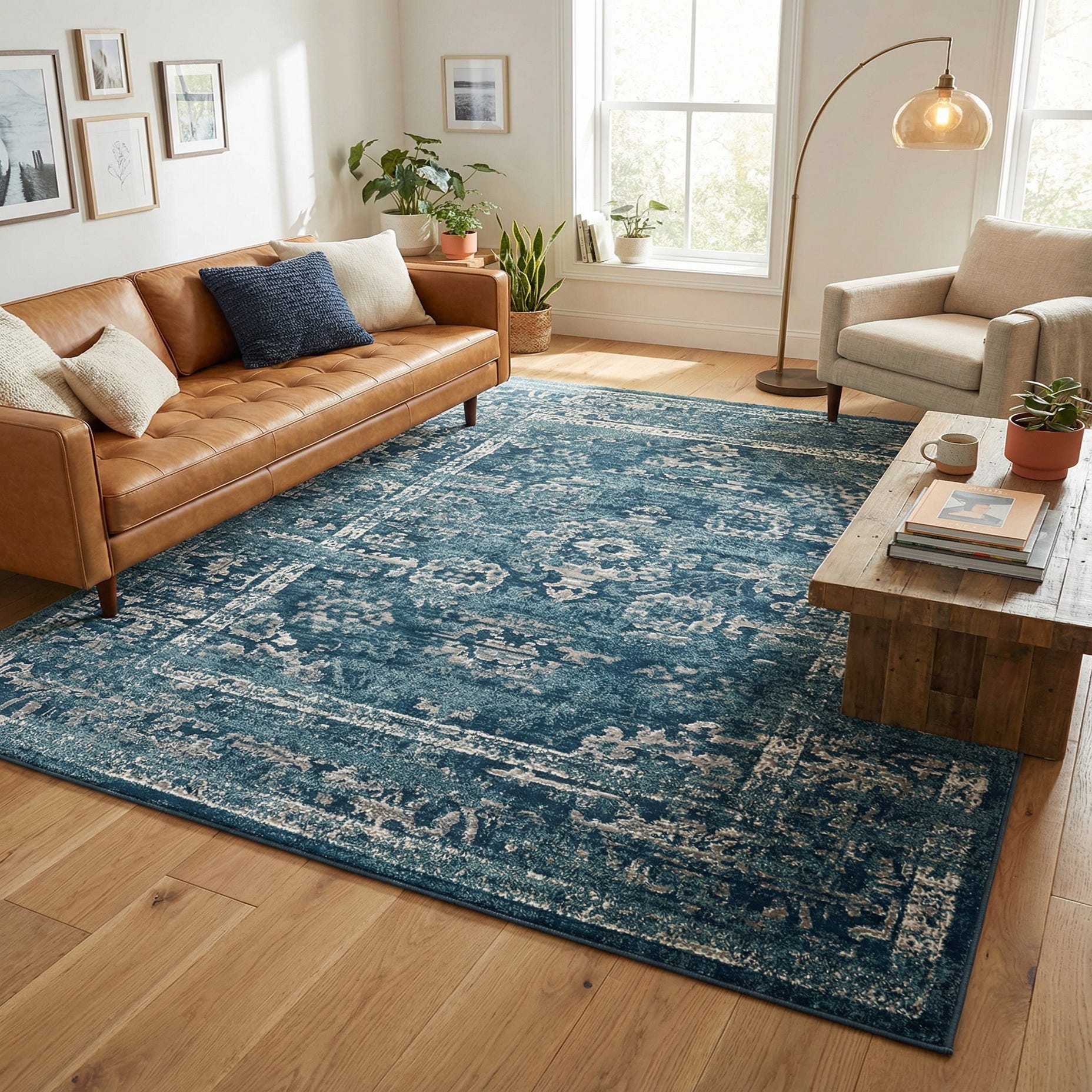 Primary color is Navy Blue. Colors in this rug include: Navy Blue, Gray, Ivory.