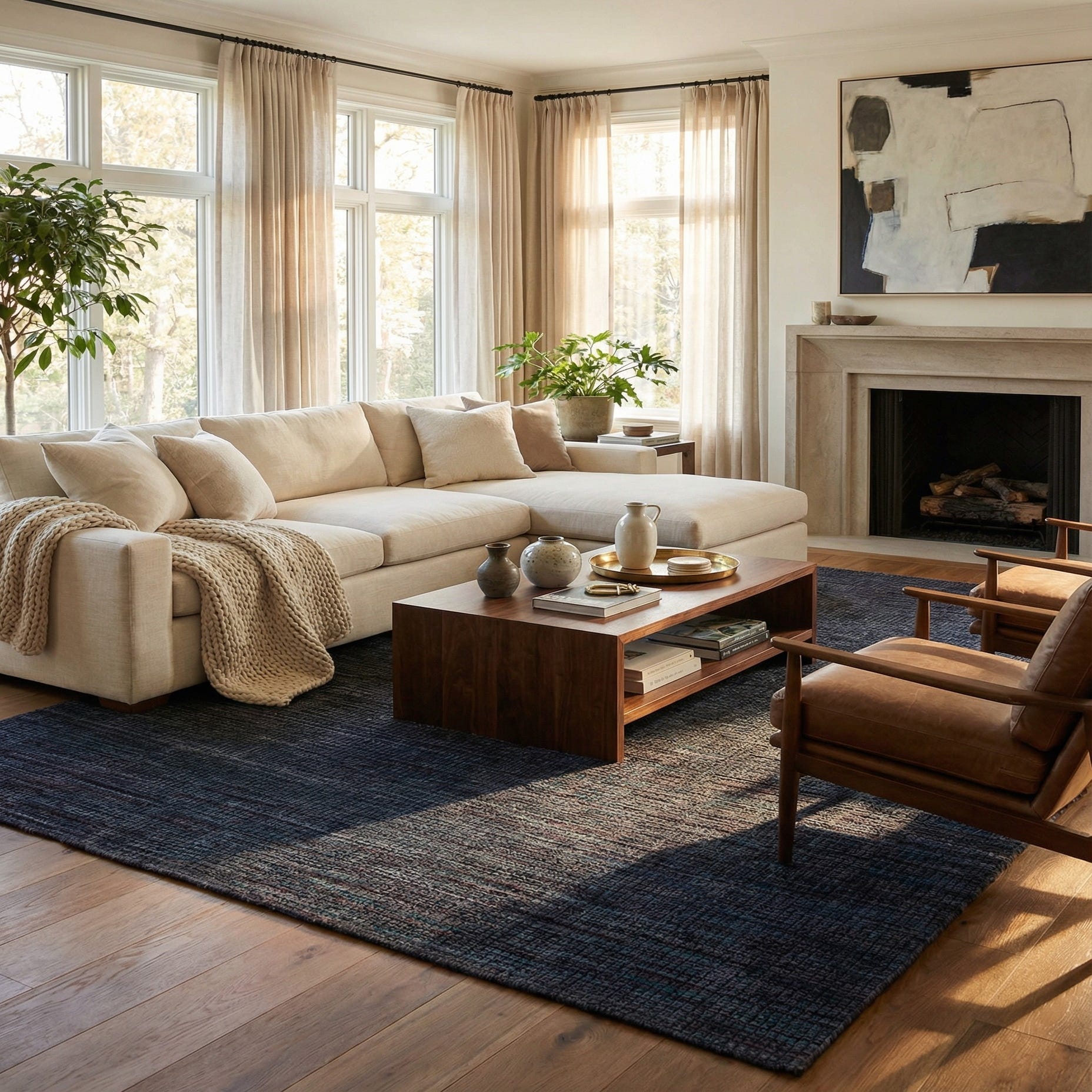 Primary color is Navy Blue. Colors in this rug include: Navy Blue, Burgundy, Gray.
