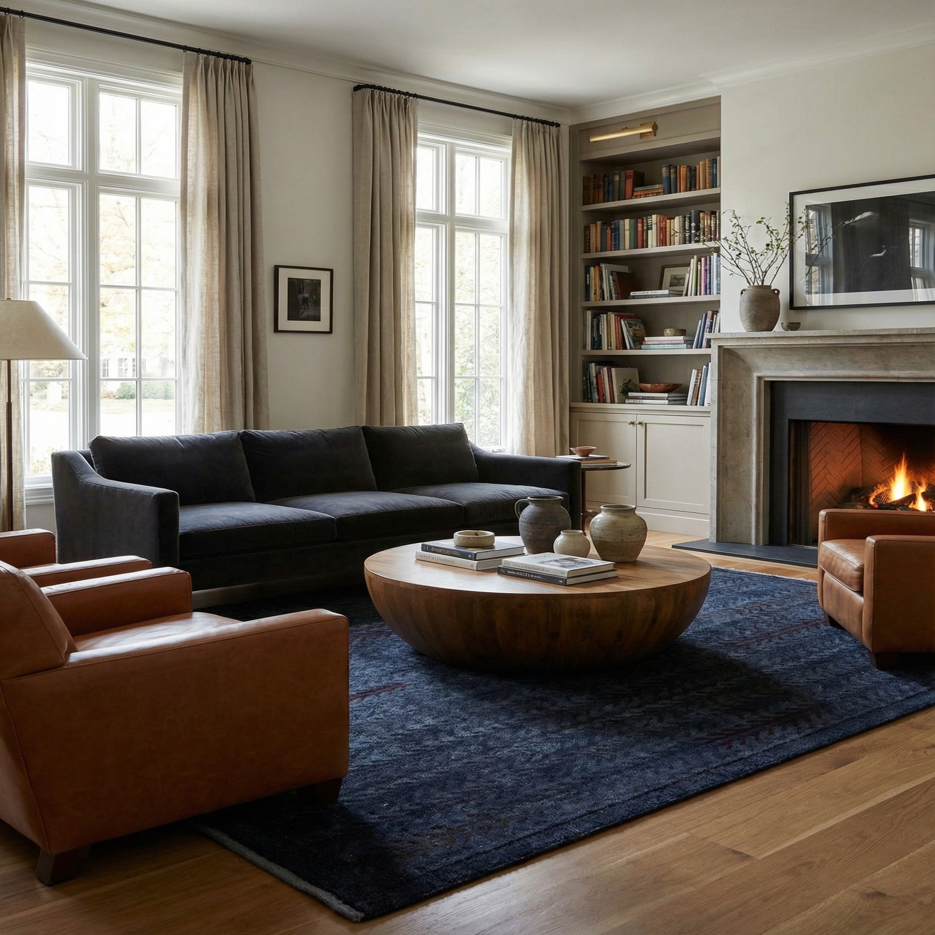 Primary color is Navy Blue. Colors in this rug include: Navy Blue, Burgundy.