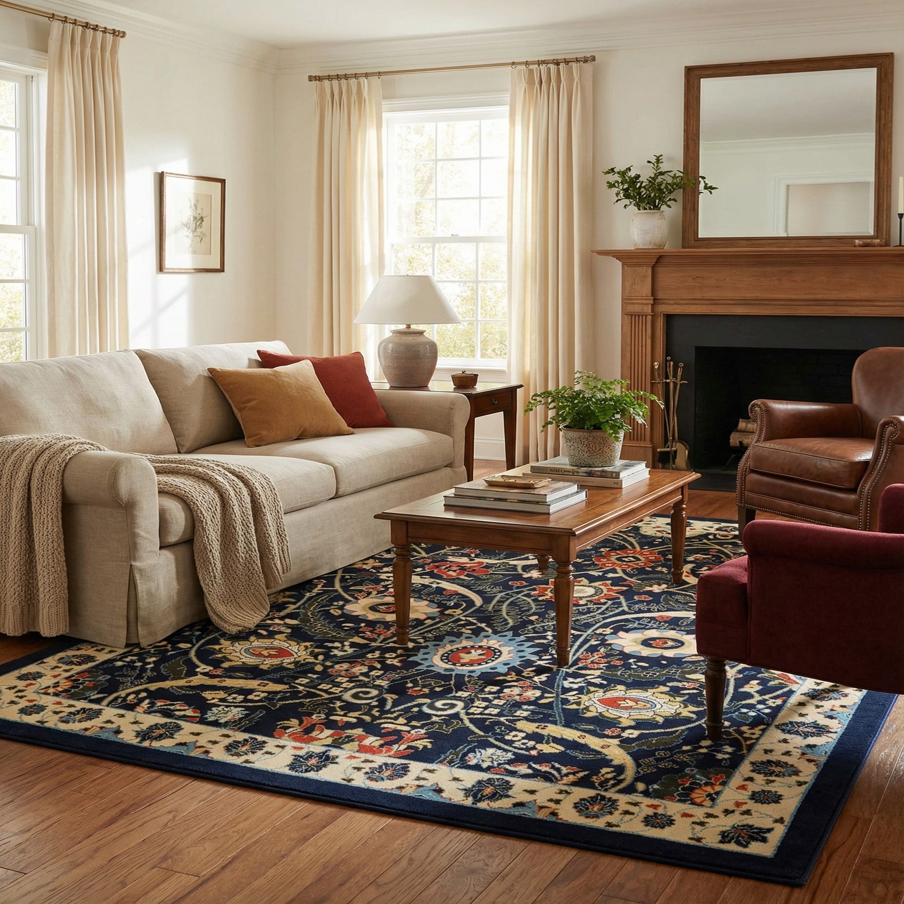 Primary color is Navy Blue. Colors in this rug include: Navy Blue, Black, Blue, Cream, Light Green, Olive, Terracotta.