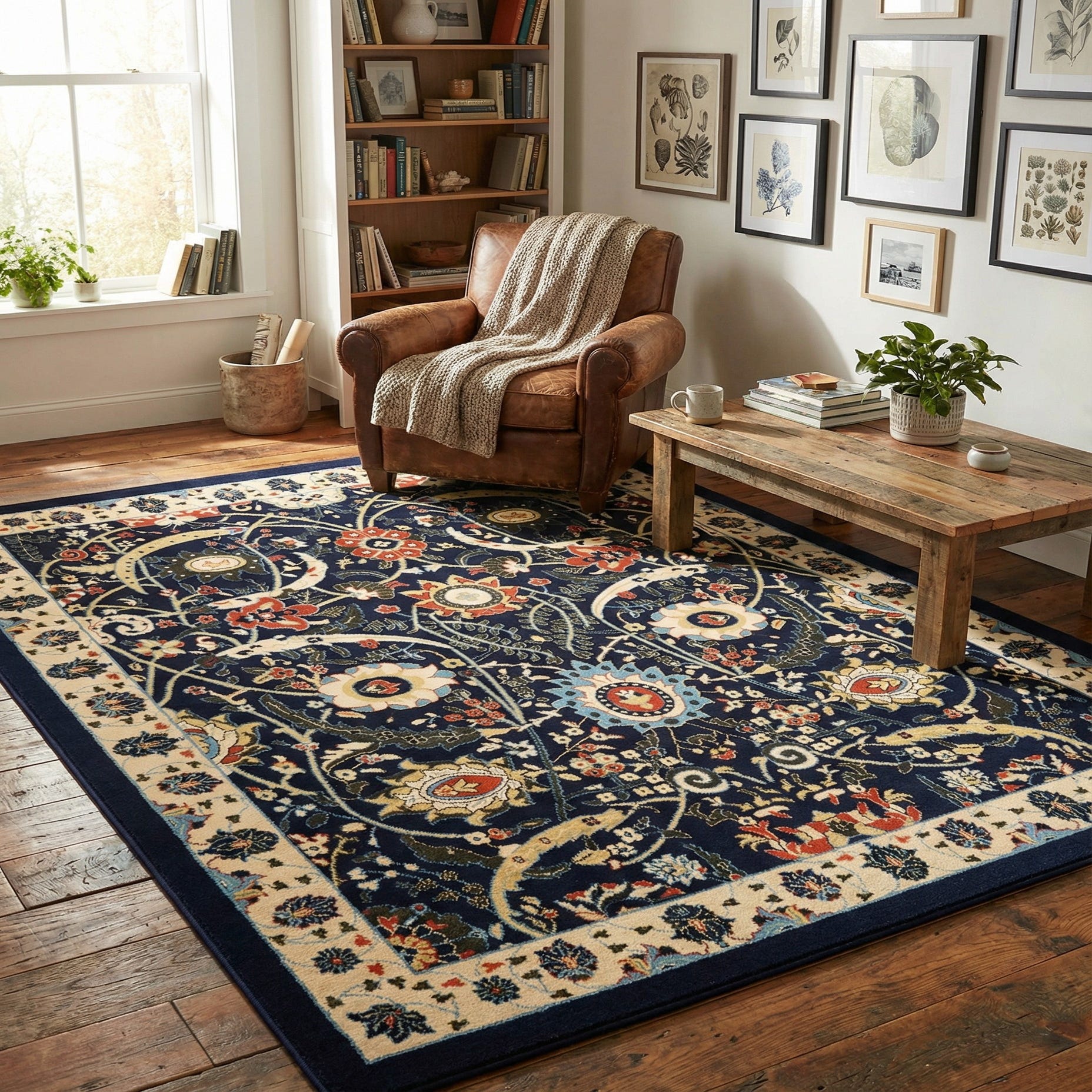 Primary color is Navy Blue. Colors in this rug include: Navy Blue, Black, Blue, Cream, Light Green, Olive, Terracotta.