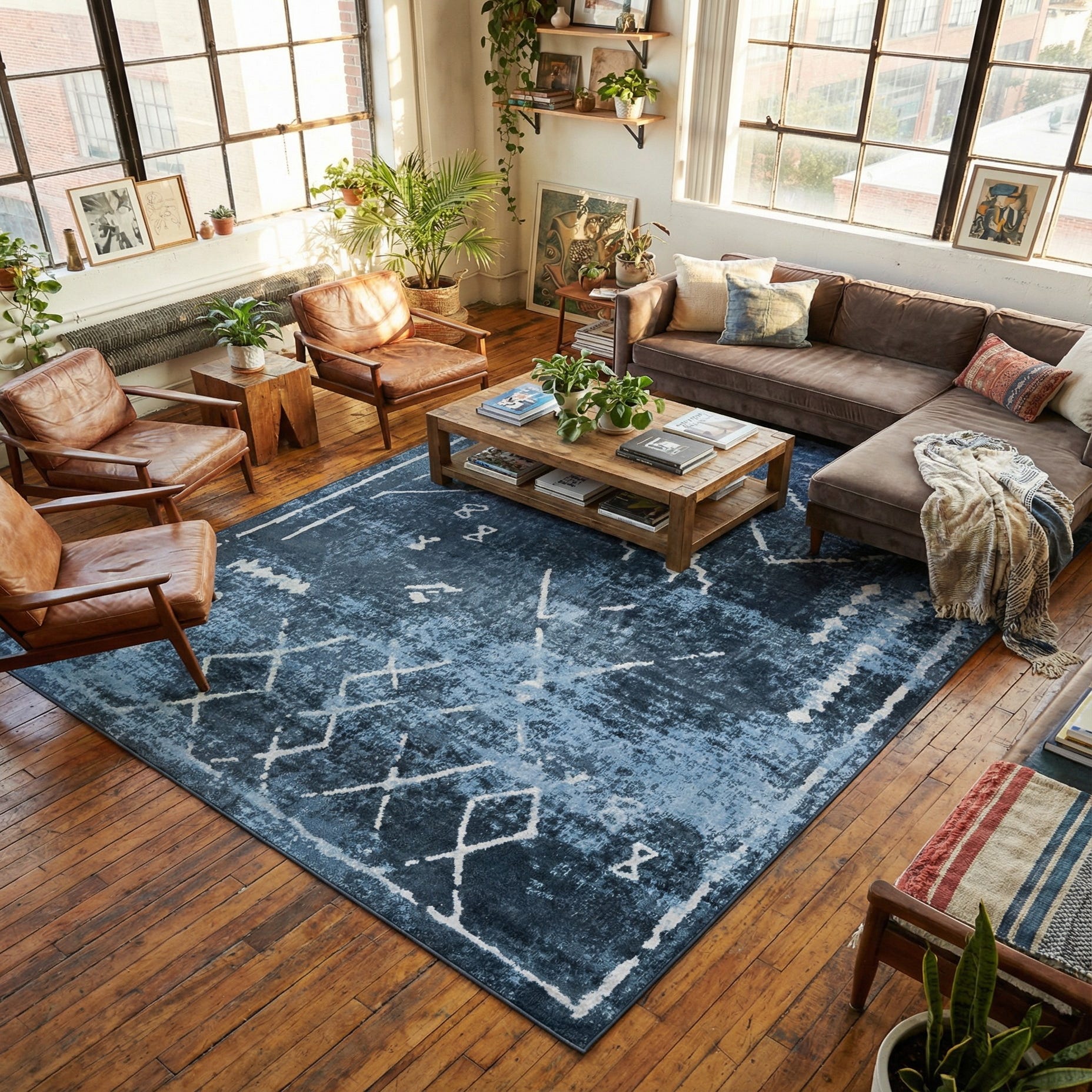Primary color is Navy Blue. Colors in this rug include: Navy Blue, Gray, Ivory, Light Blue.
