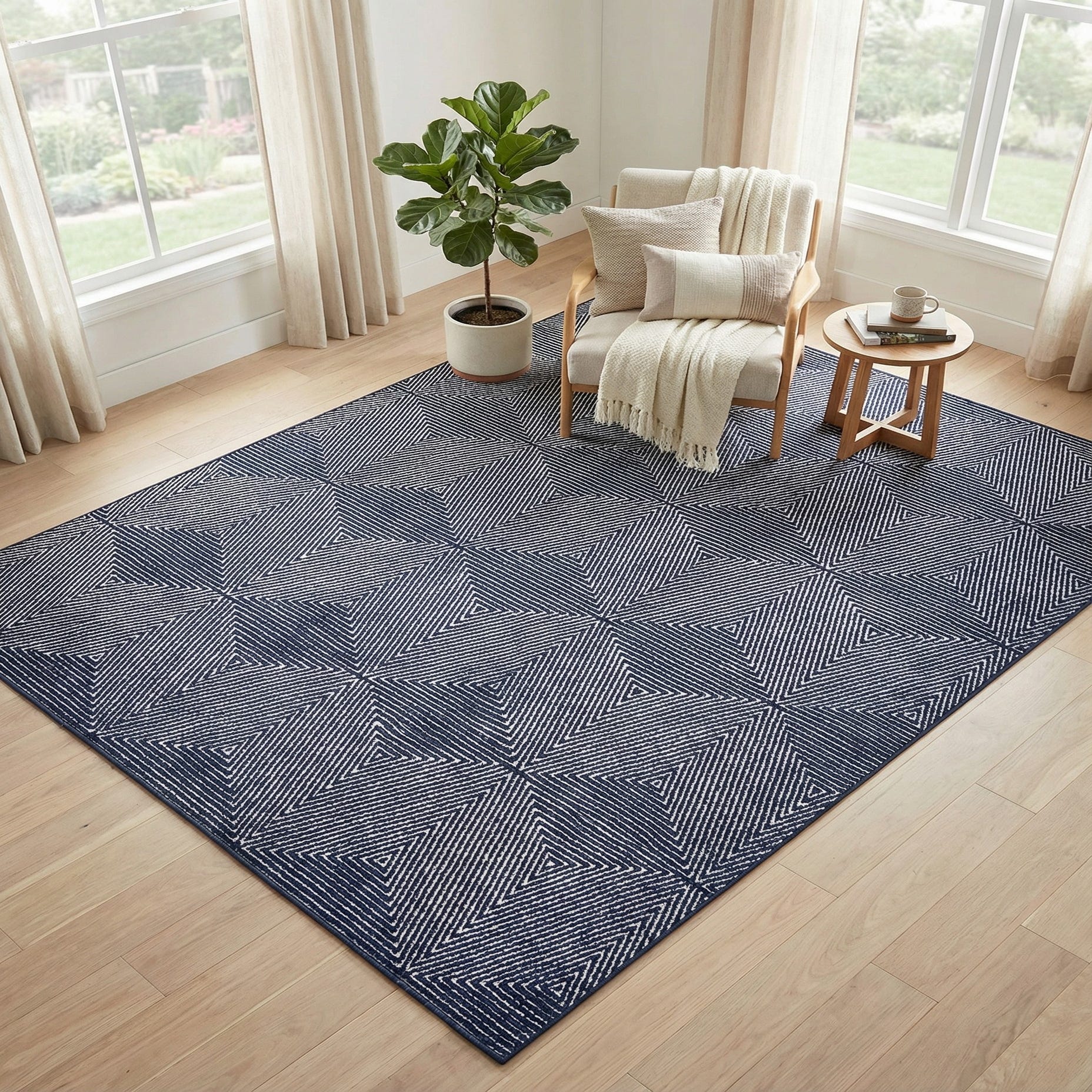 Primary color is Navy Blue. Colors in this rug include: Navy Blue, Ivory.