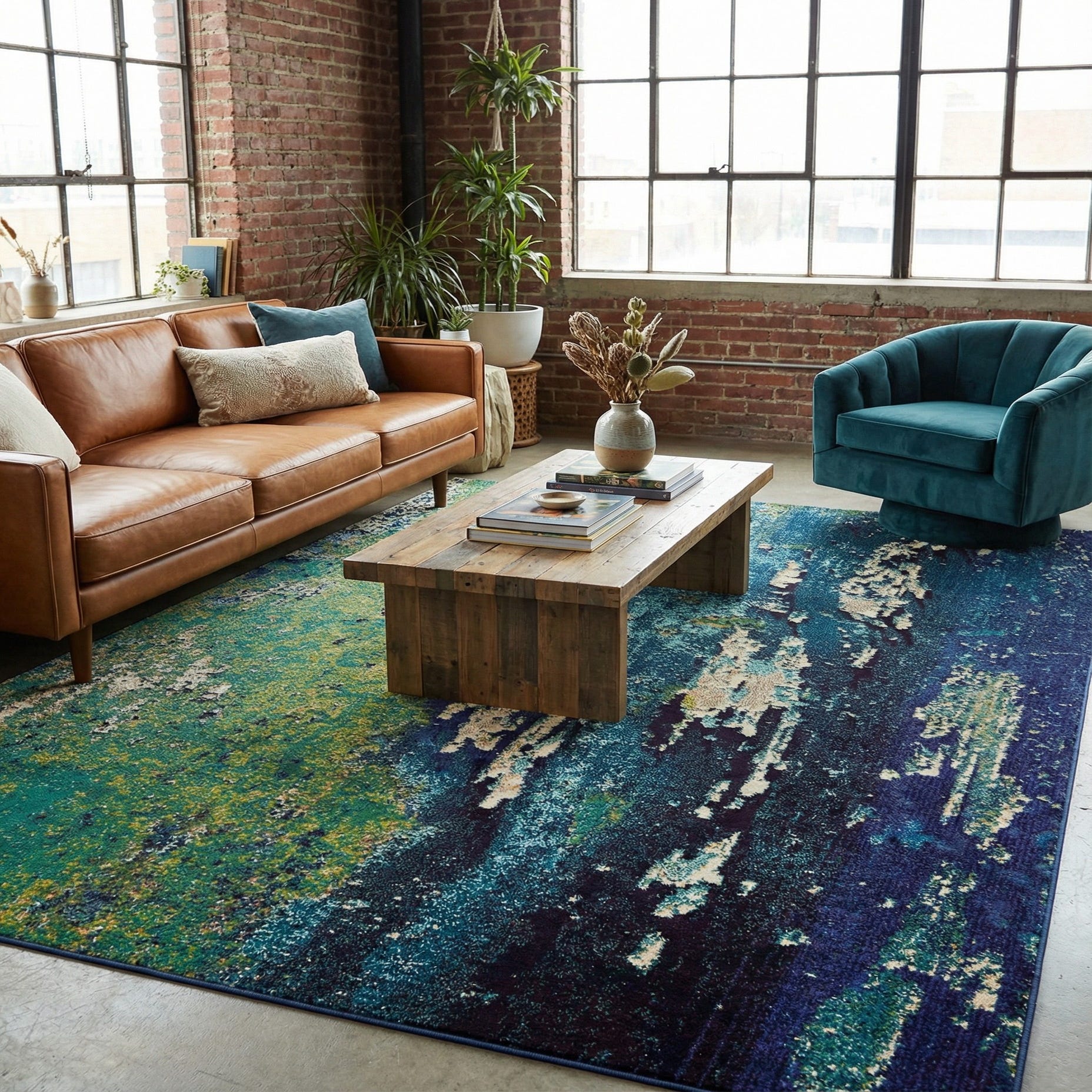 Primary color is Navy Blue. Colors in this rug include: Navy Blue, Beige, Blue, Green, Light Blue, Yellow.