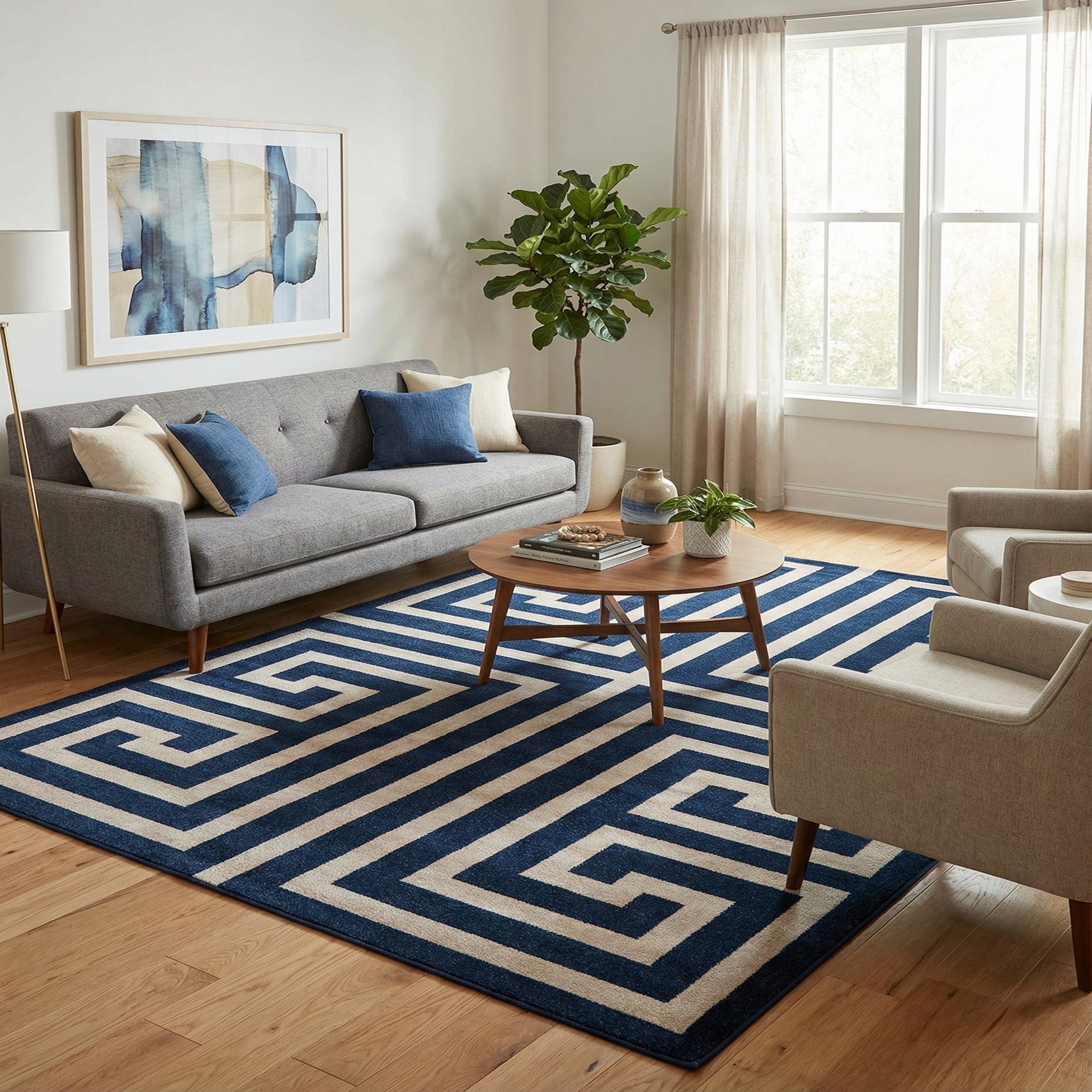 Primary color is Navy Blue. Colors in this rug include: Navy Blue, Beige.