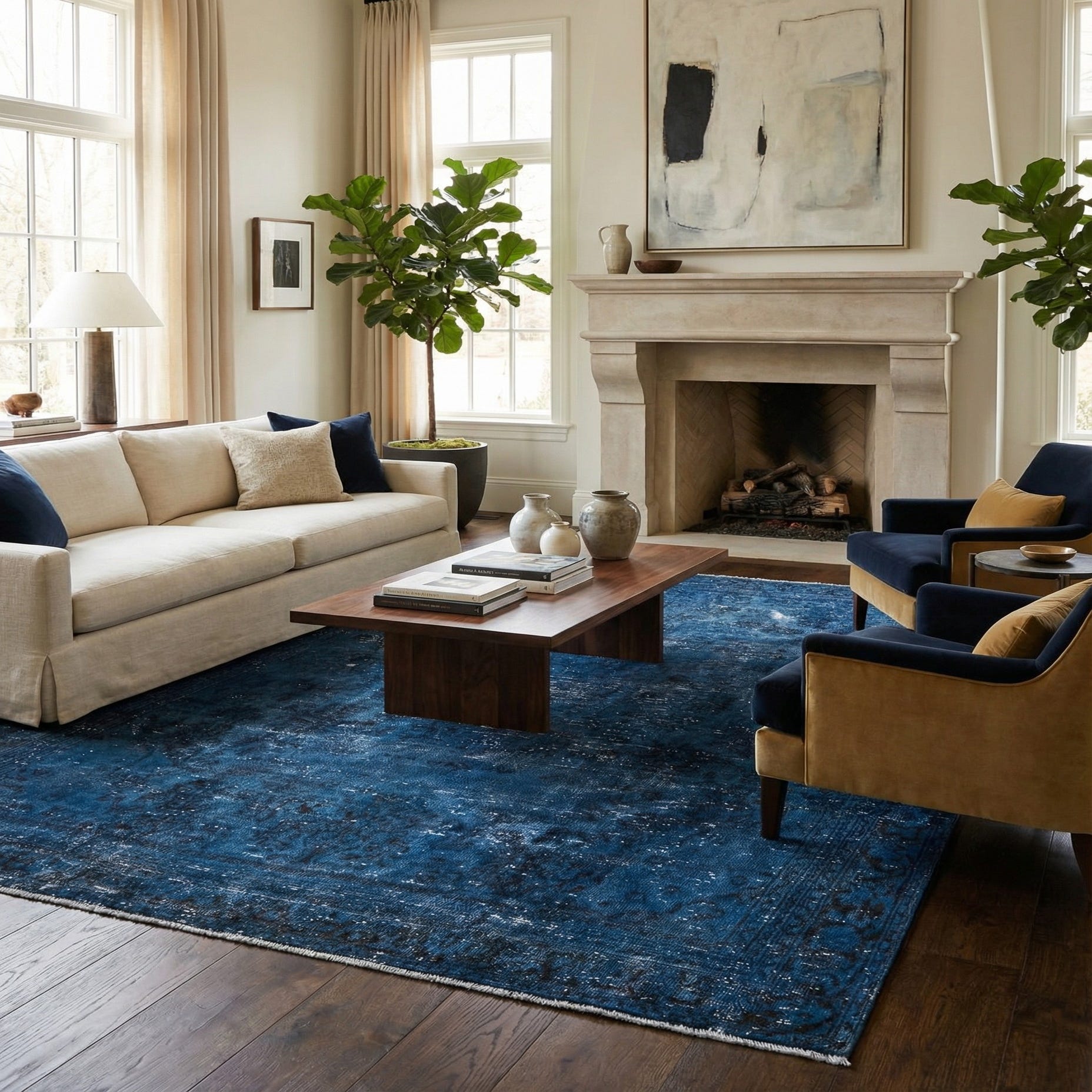 Primary color is Navy Blue. Colors in this rug include: Navy Blue, Black, Ivory.