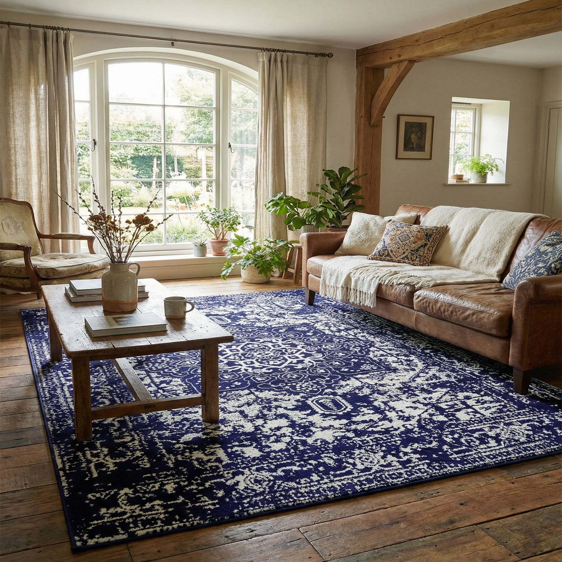 Primary color is Navy Blue. Colors in this rug include: Navy Blue, Ivory.