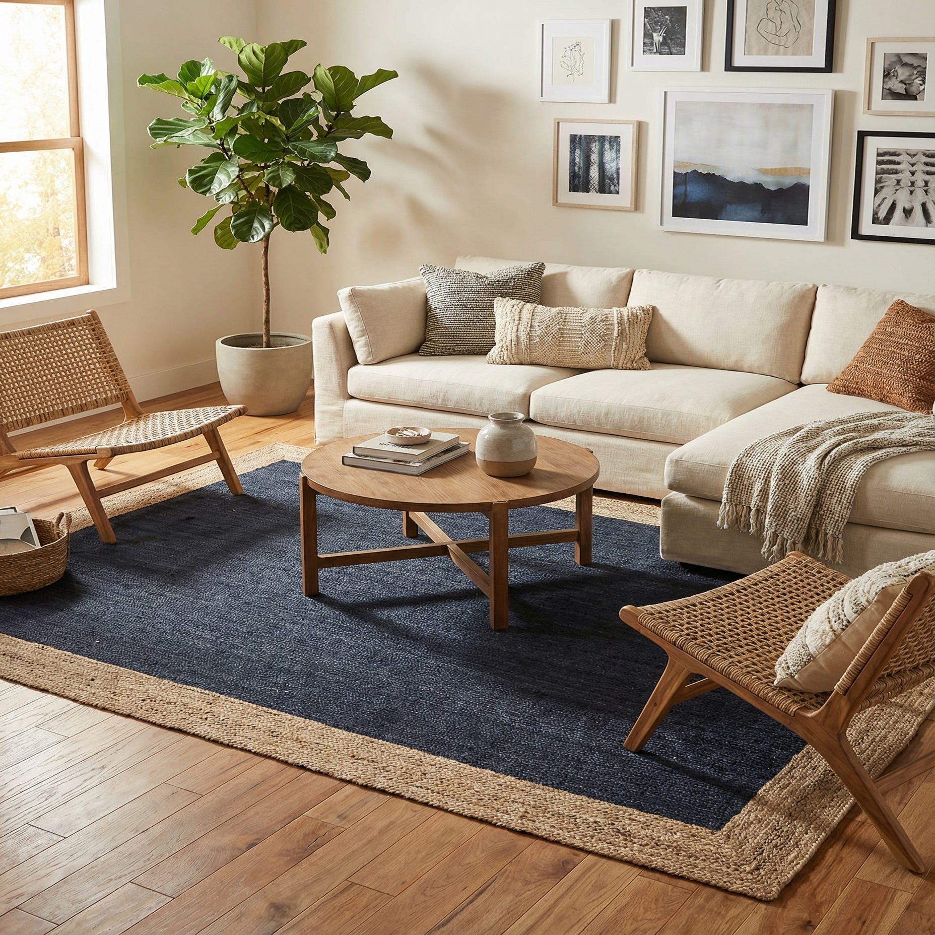 Primary color is Navy Blue. Colors in this rug include: Navy Blue, Tan.