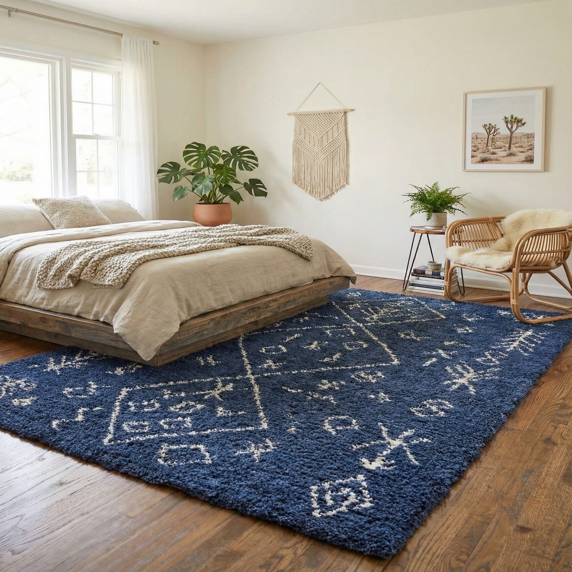 Primary color is Navy Blue. Colors in this rug include: Navy Blue, Ivory.