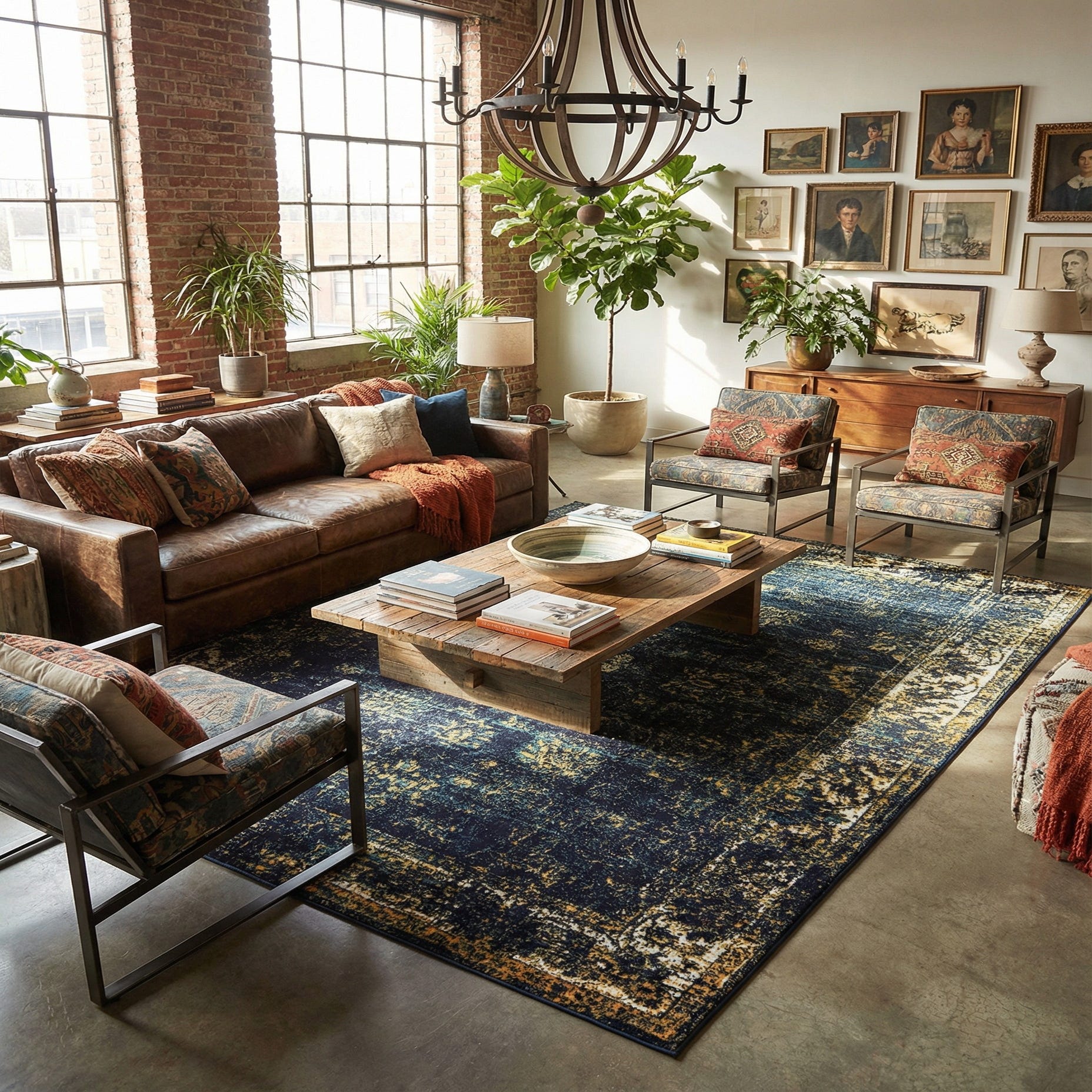 Primary color is Navy Blue. Colors in this rug include: Navy Blue, Ivory, Yellow.