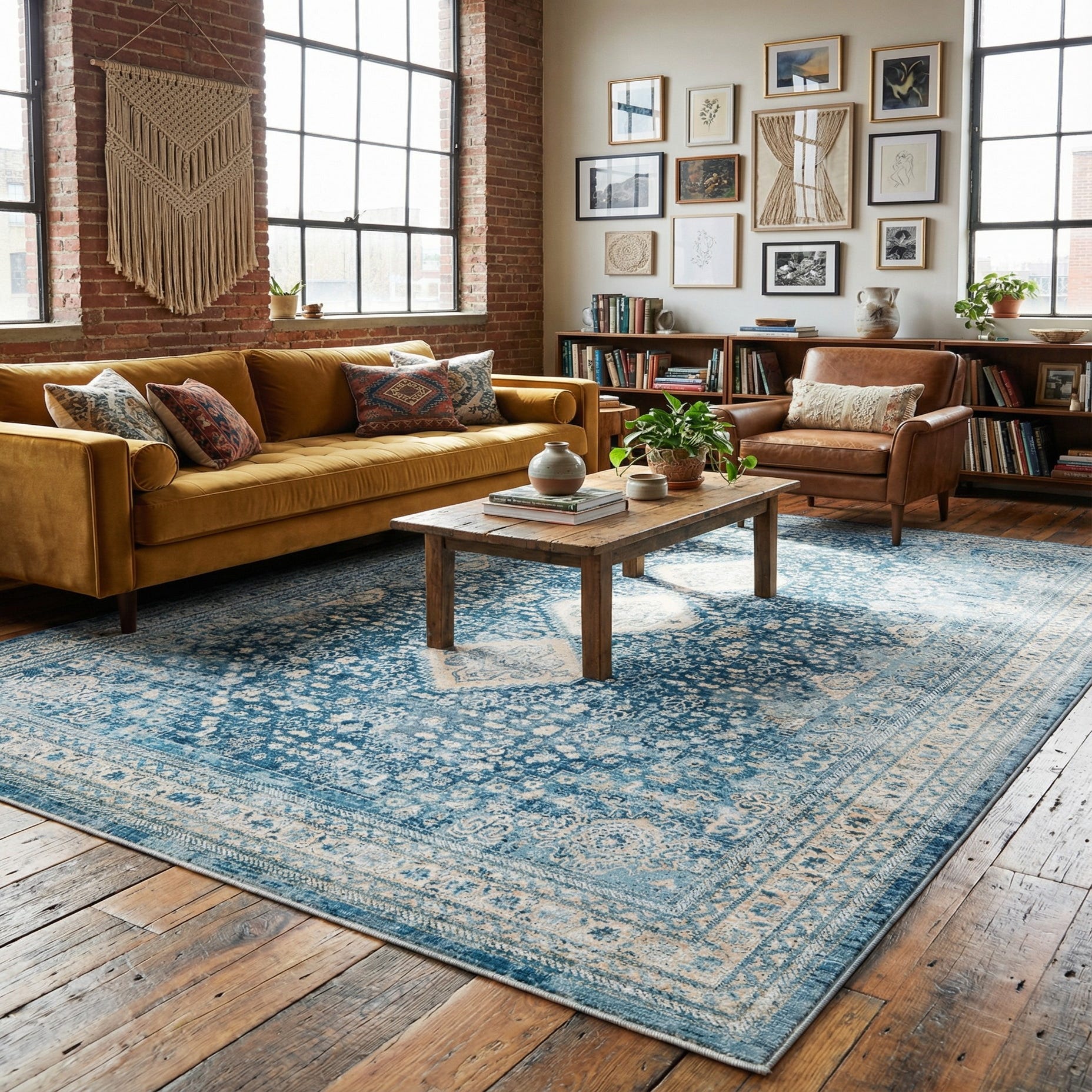 Primary color is Navy Blue. Colors in this rug include: Navy Blue, Ivory, Light Blue.