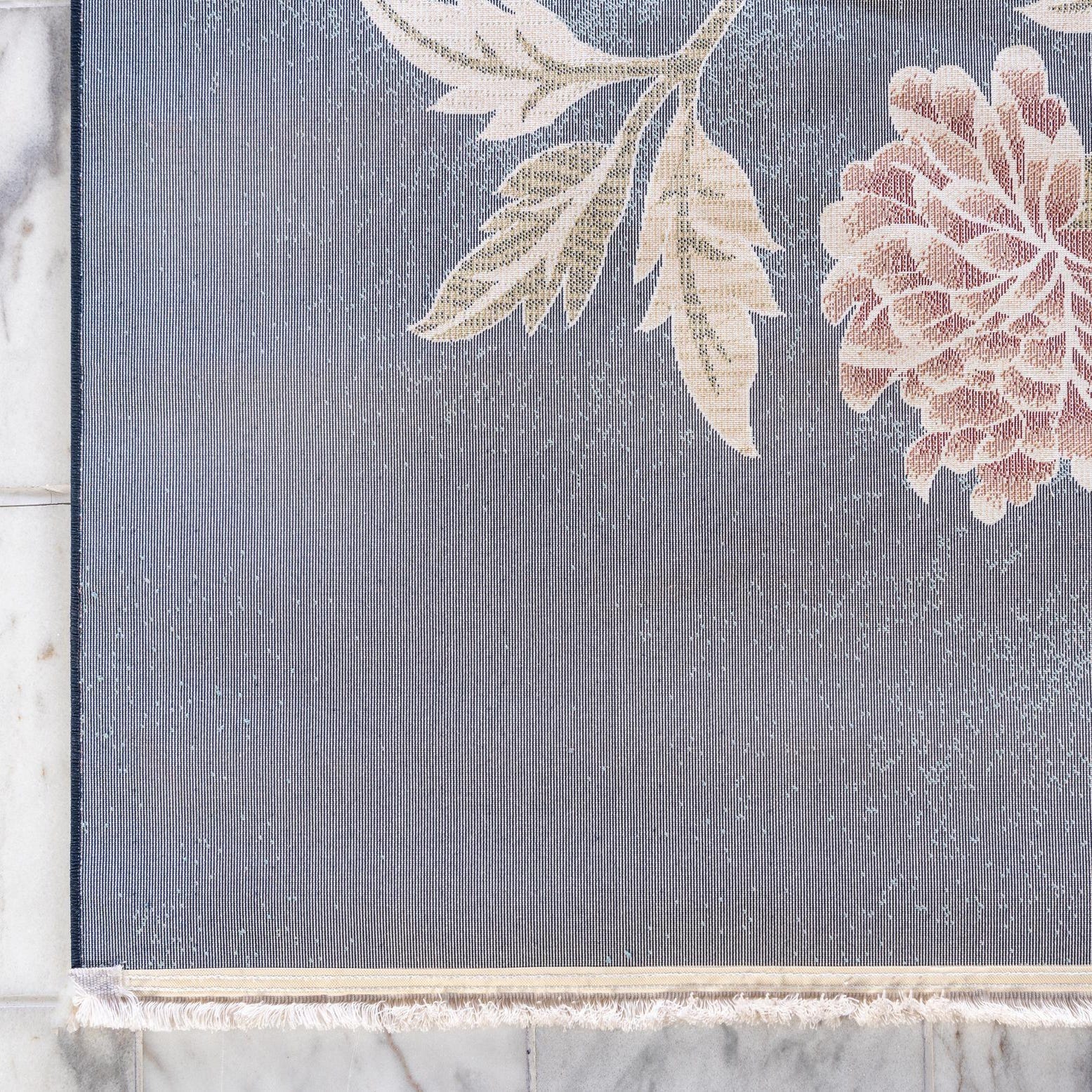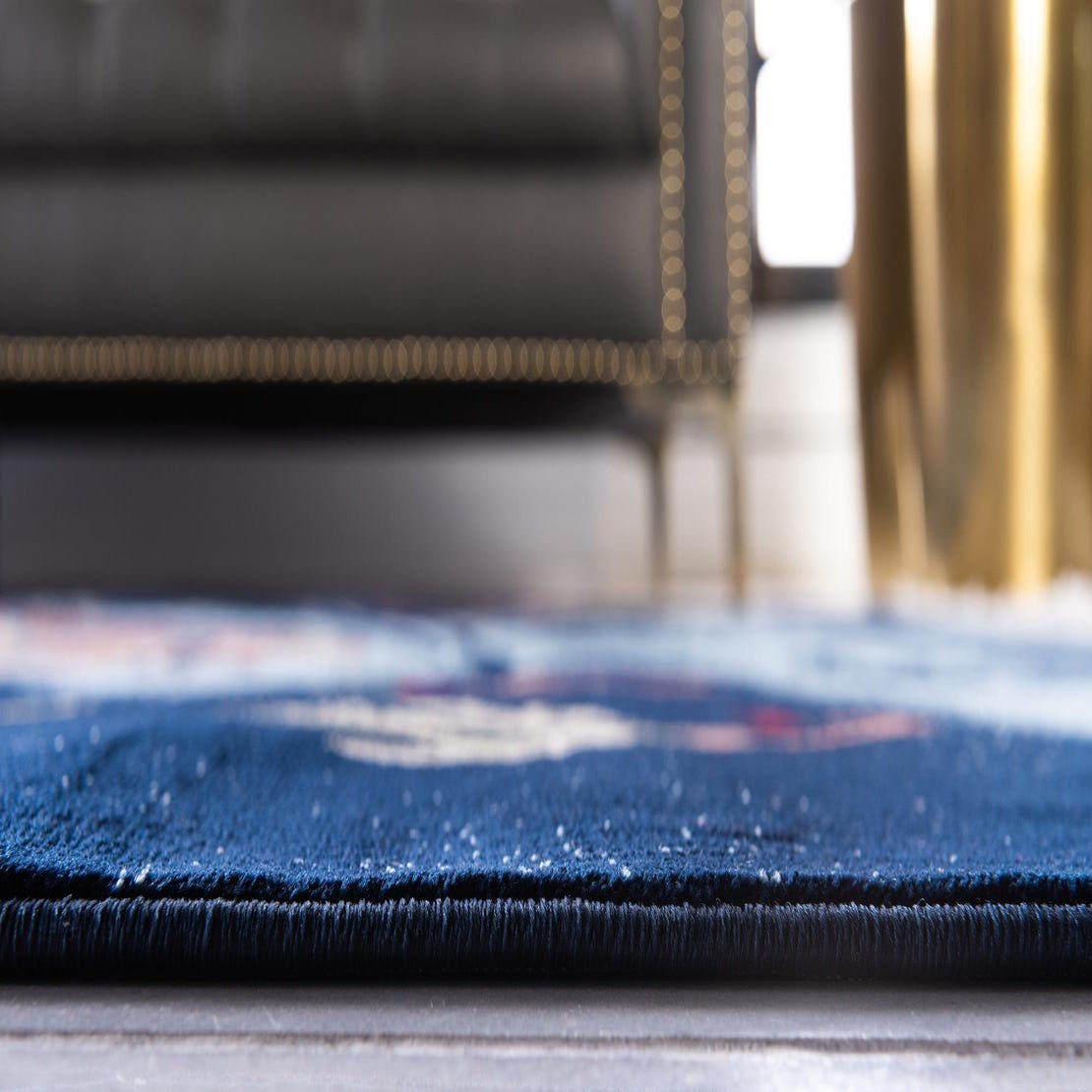 Primary color is Navy Blue. Colors in this rug include: Navy Blue, Black, Green, Ivory, Light Blue, Peach, Puce, Tan.