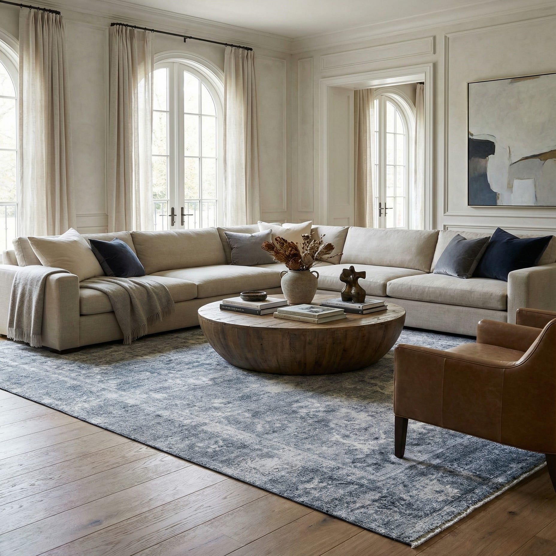 Primary color is Navy Blue. Colors in this rug include: Navy Blue, Ivory.