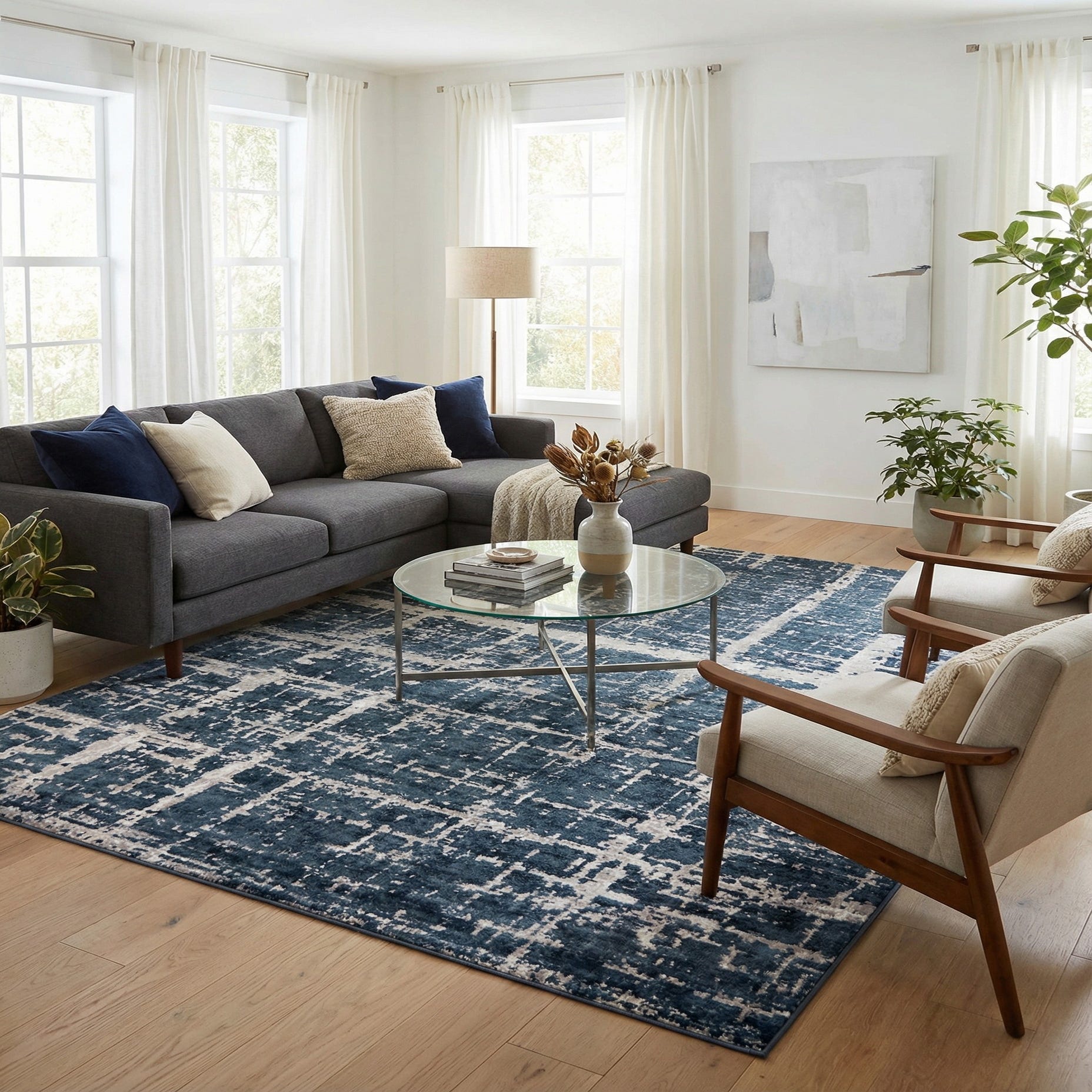 Primary color is Navy Blue. Colors in this rug include: Navy Blue, Beige.