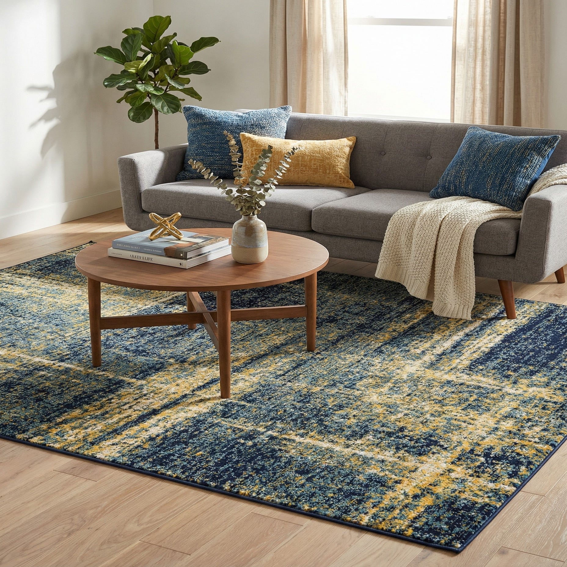 Primary color is Navy Blue and Yellow. Colors in this rug include: Navy Blue and Yellow, Blue, Ivory.