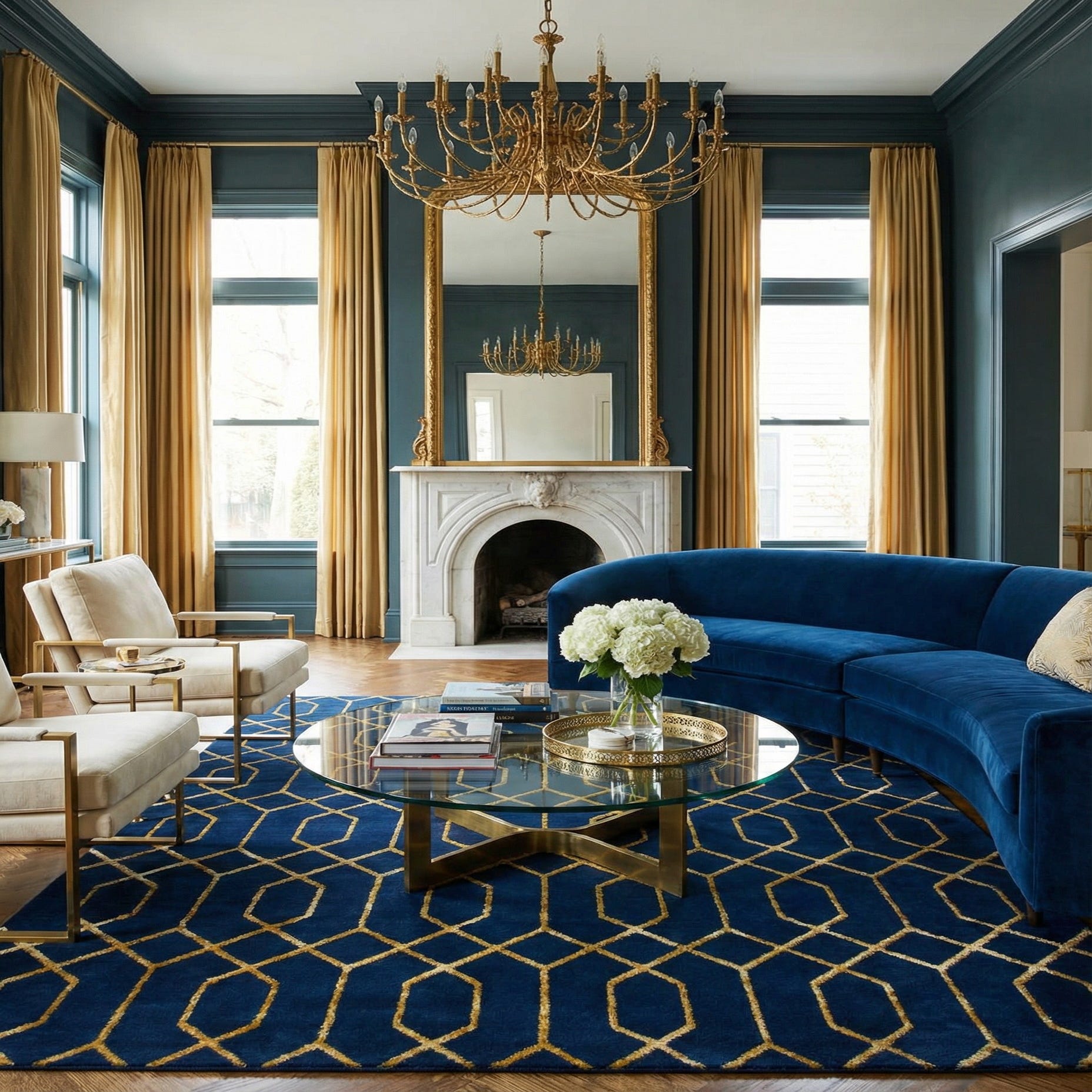 Primary color is Navy Blue Gold. Colors in this rug include: Navy Blue Gold, Gold.