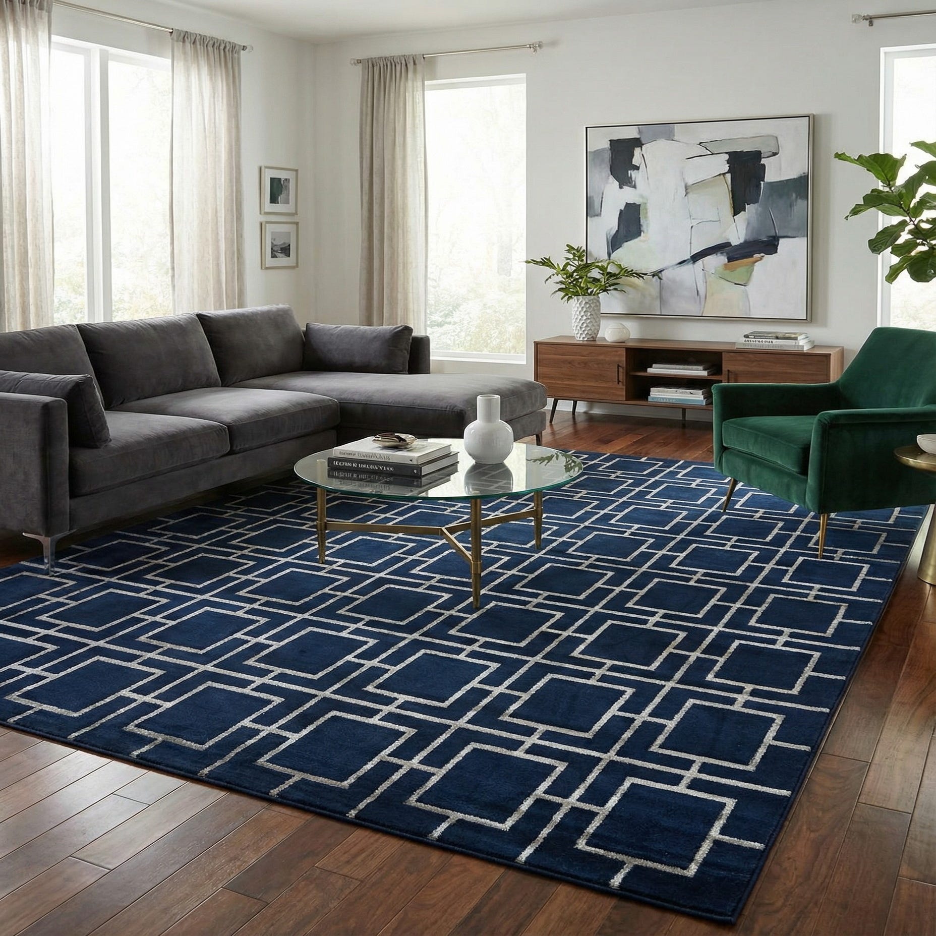 Primary color is Navy Blue Silver. Colors in this rug include: Navy Blue Silver, Silver.