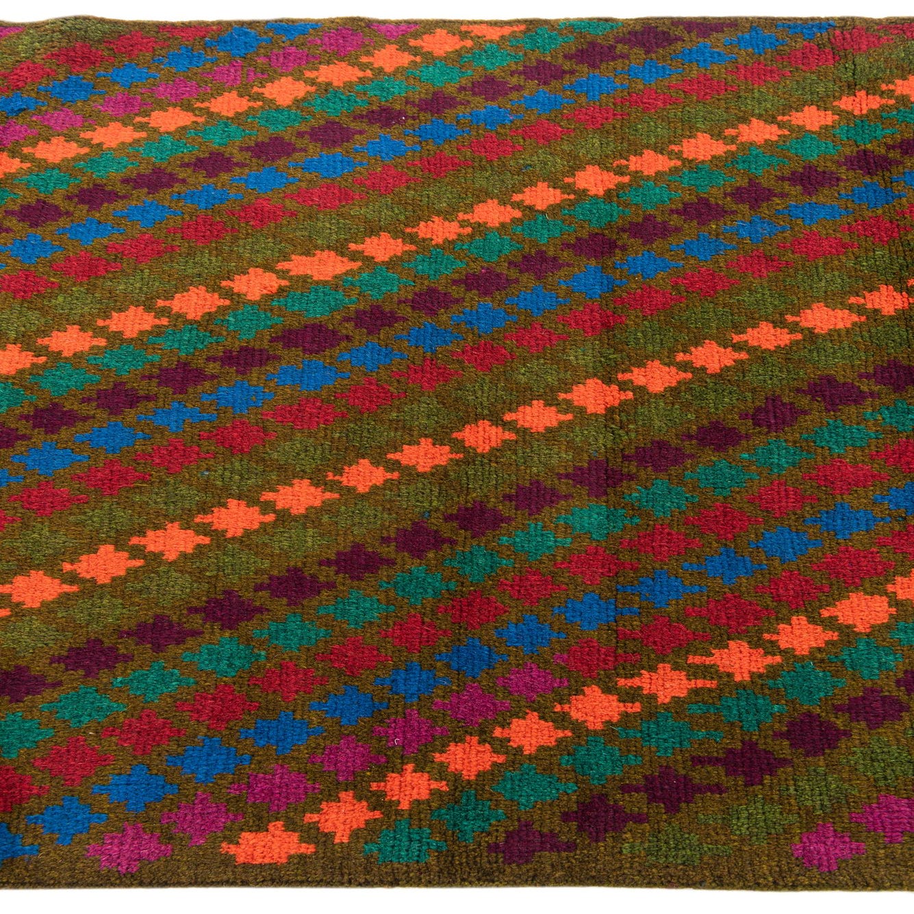 Primary color is Olive. Colors in this rug include: Olive, Green, Maroon, Orange, Red, Pink.