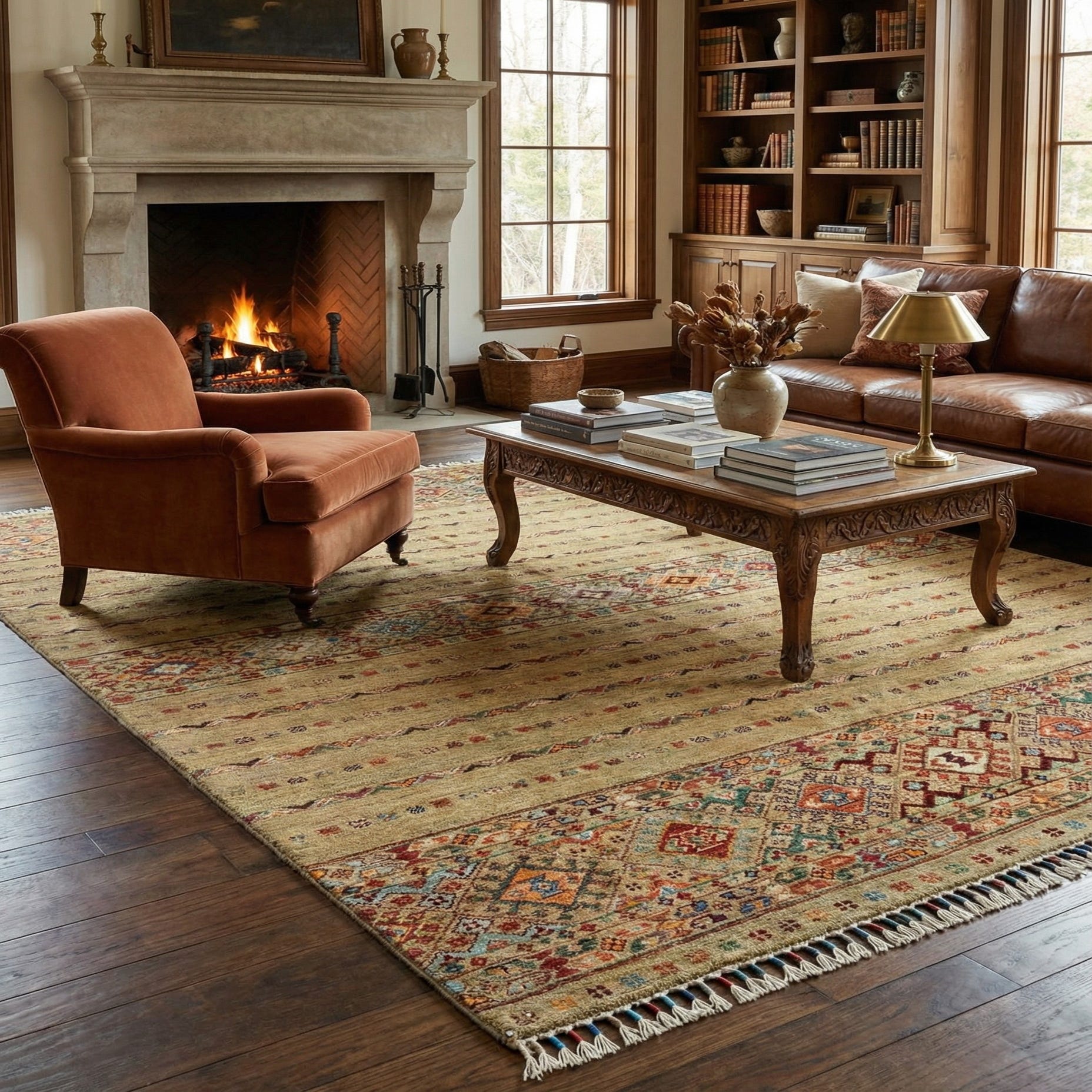 Primary color is Olive. Colors in this rug include: Olive, Beige.