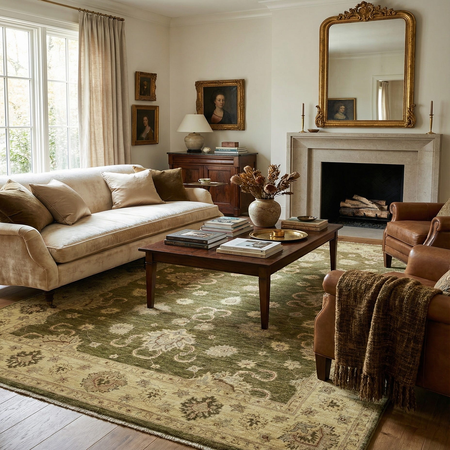 Primary color is Olive. Colors in this rug include: Olive, Beige, Brown, Terracotta, Light Brown.