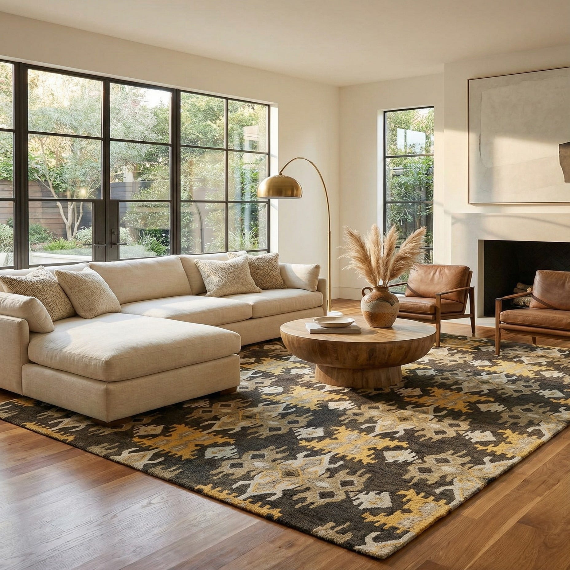 Primary color is Olive. Colors in this rug include: Olive, Gray, Ivory, Gold, Brown.