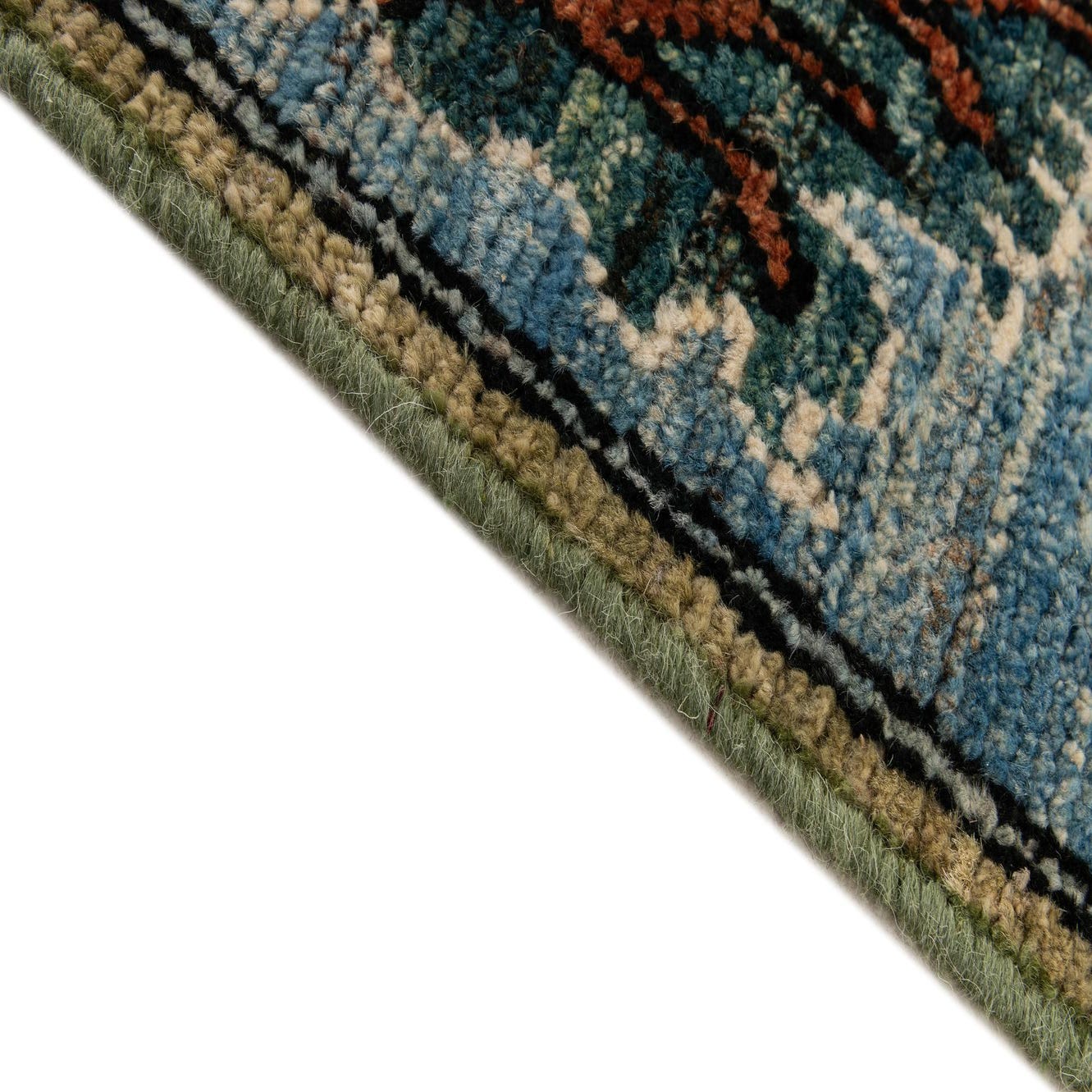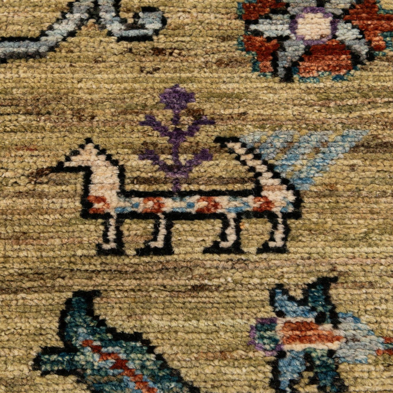 Primary color is Olive. Colors in this rug include: Olive, Beige, Black, Blue, Brown, Light Blue, Violet, Green, Light Brown.