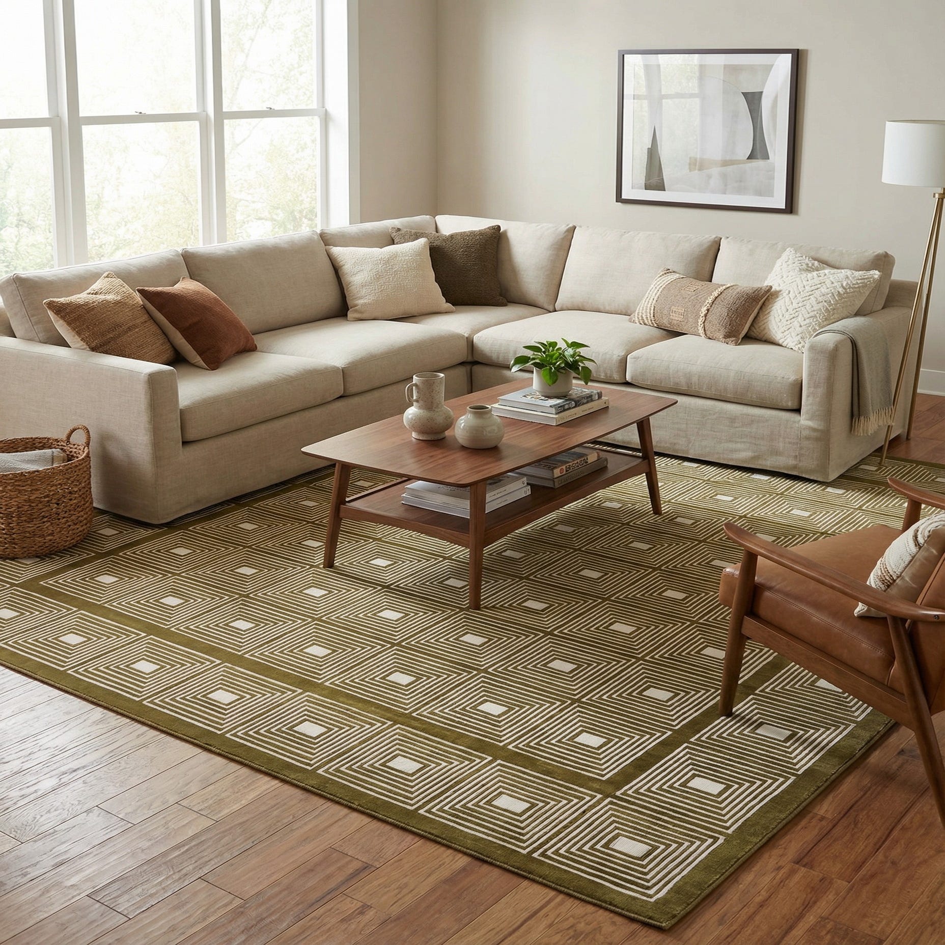 Primary color is Olive Green. Colors in this rug include: Olive Green, Ivory.