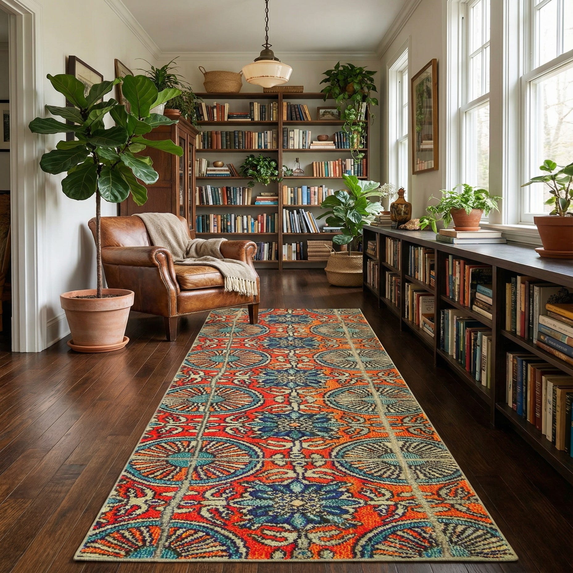 Primary color is Orange. Colors in this rug include: Orange, Blue, Brown, Green, Beige.
