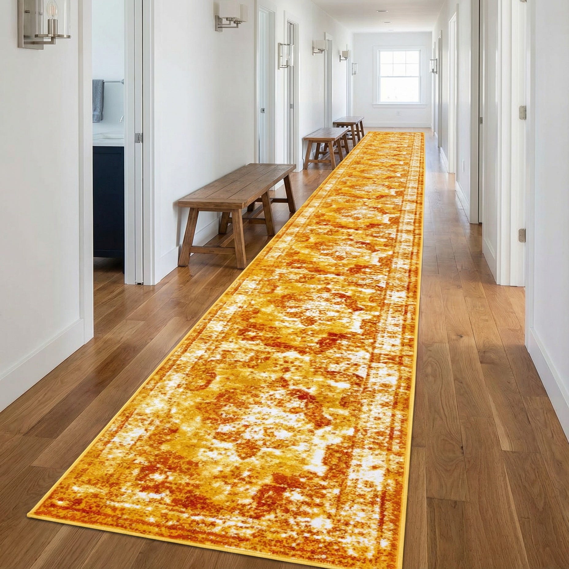 Primary color is Orange. Colors in this rug include: Orange, Gold, Ivory.