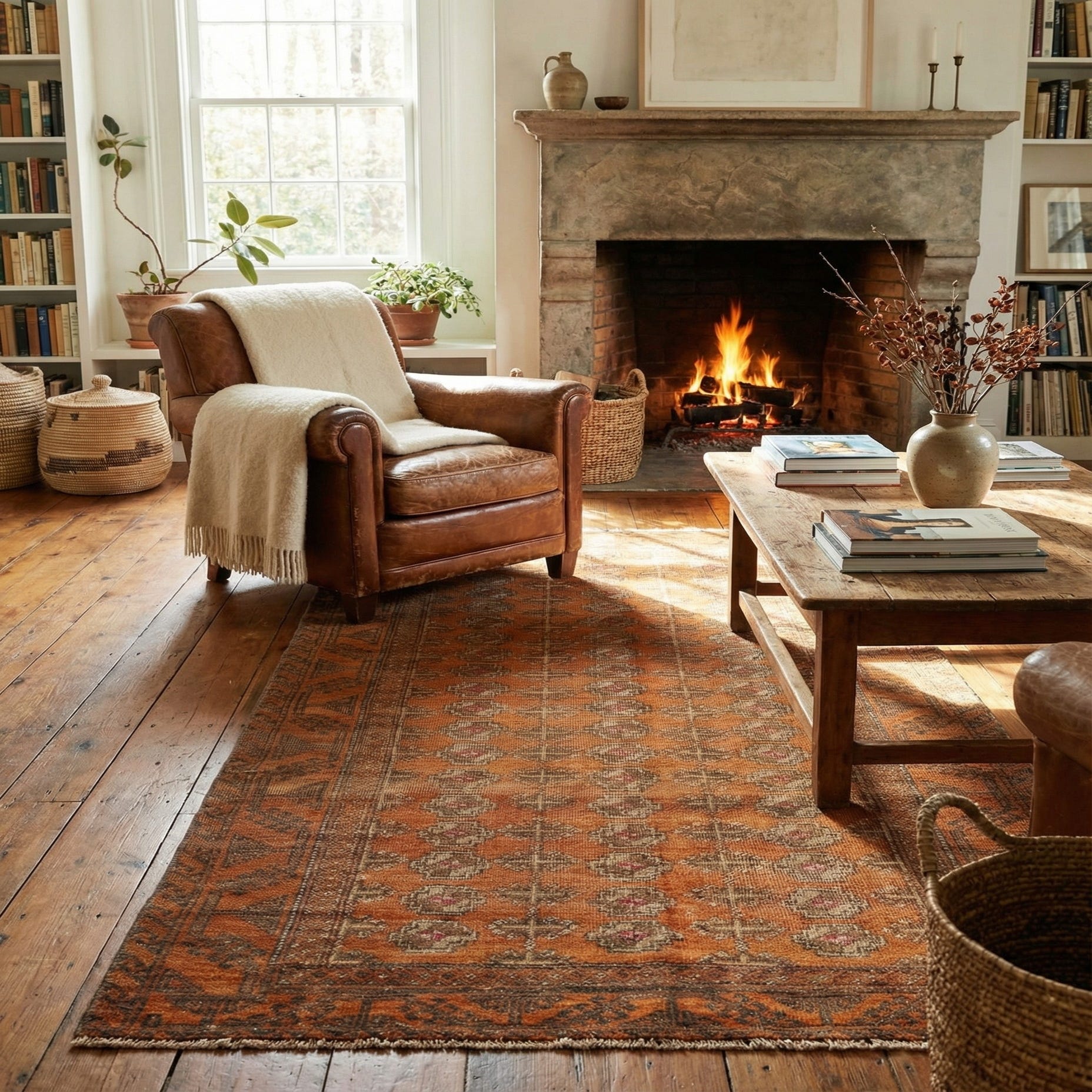 Primary color is Orange. Colors in this rug include: Orange, Brown, Red, Grey.