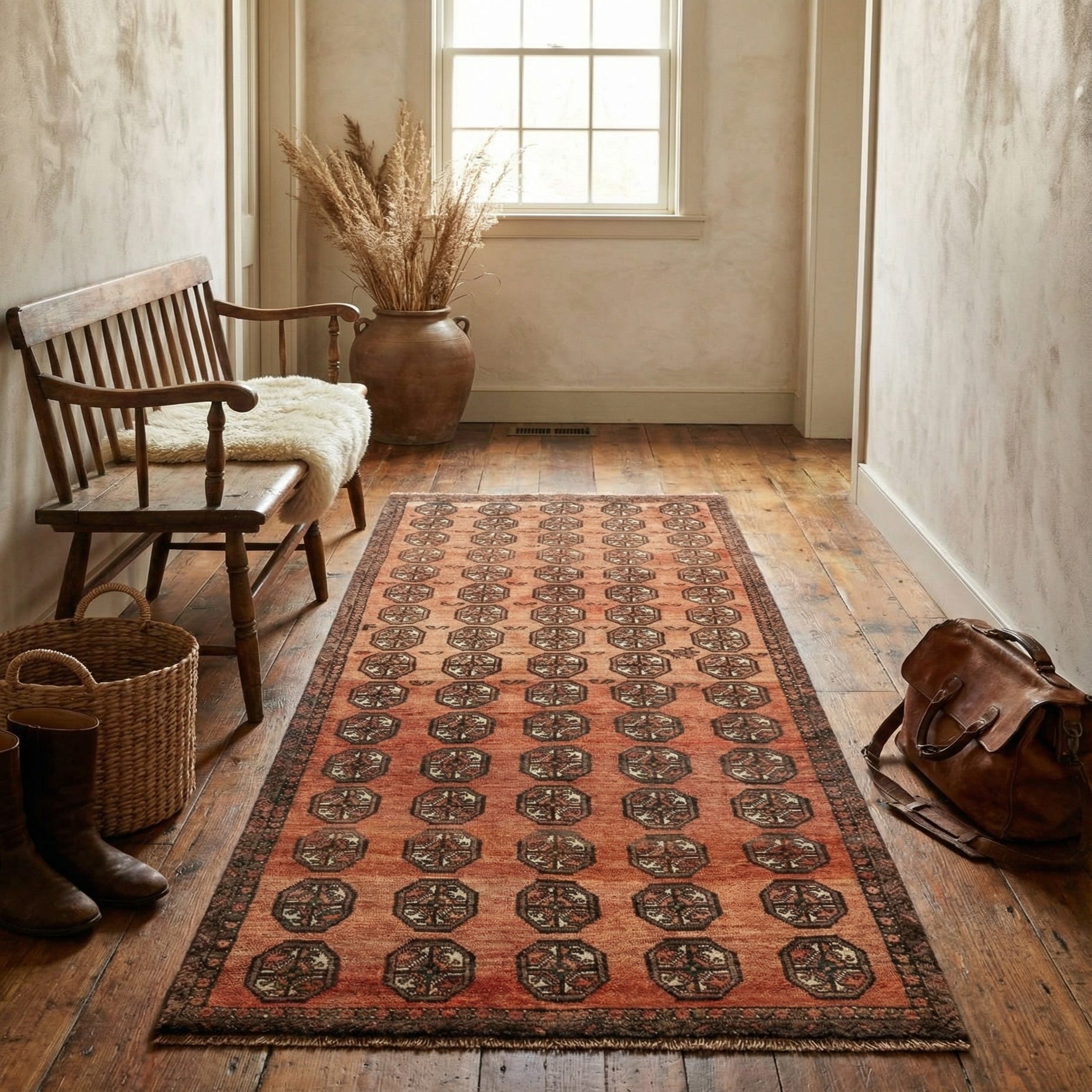 Primary color is Orange. Colors in this rug include: Orange, Brown, Red.