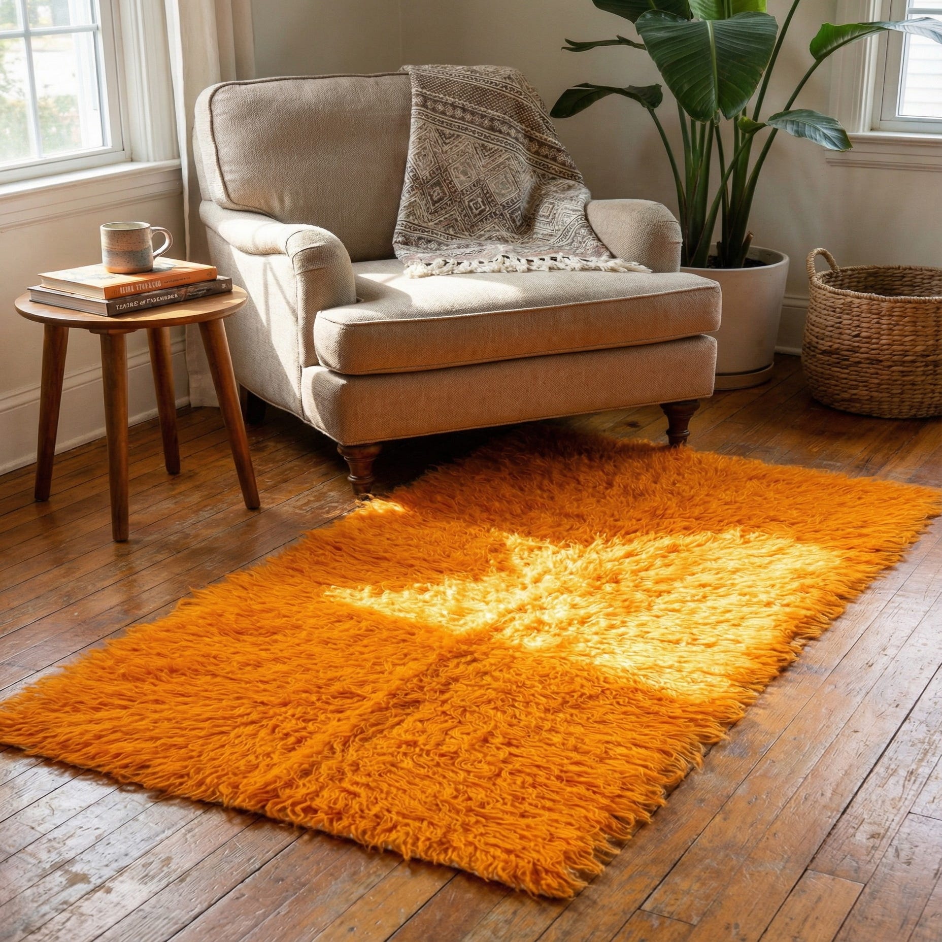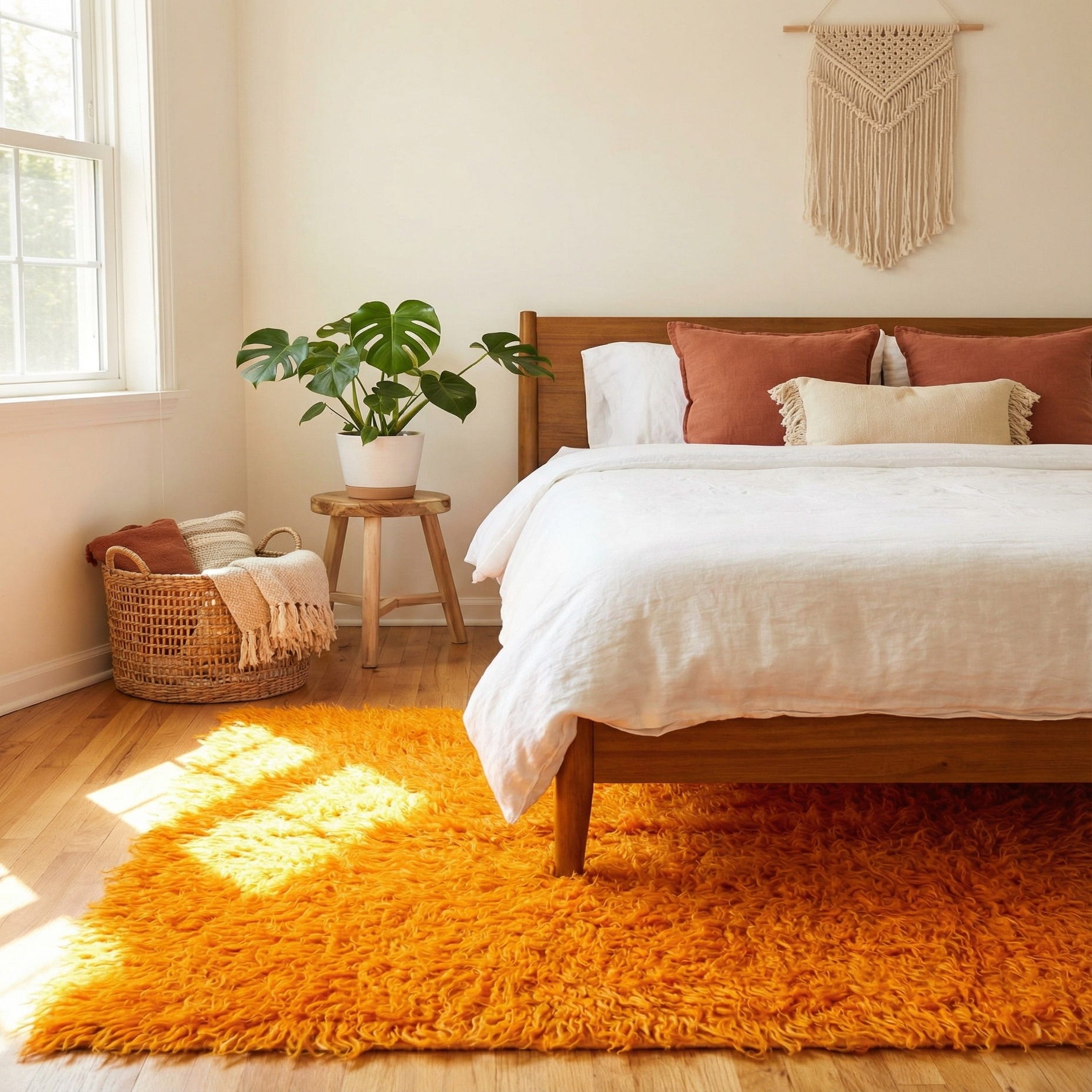 Primary color is Orange. Colors in this rug include: Orange, Ivory.