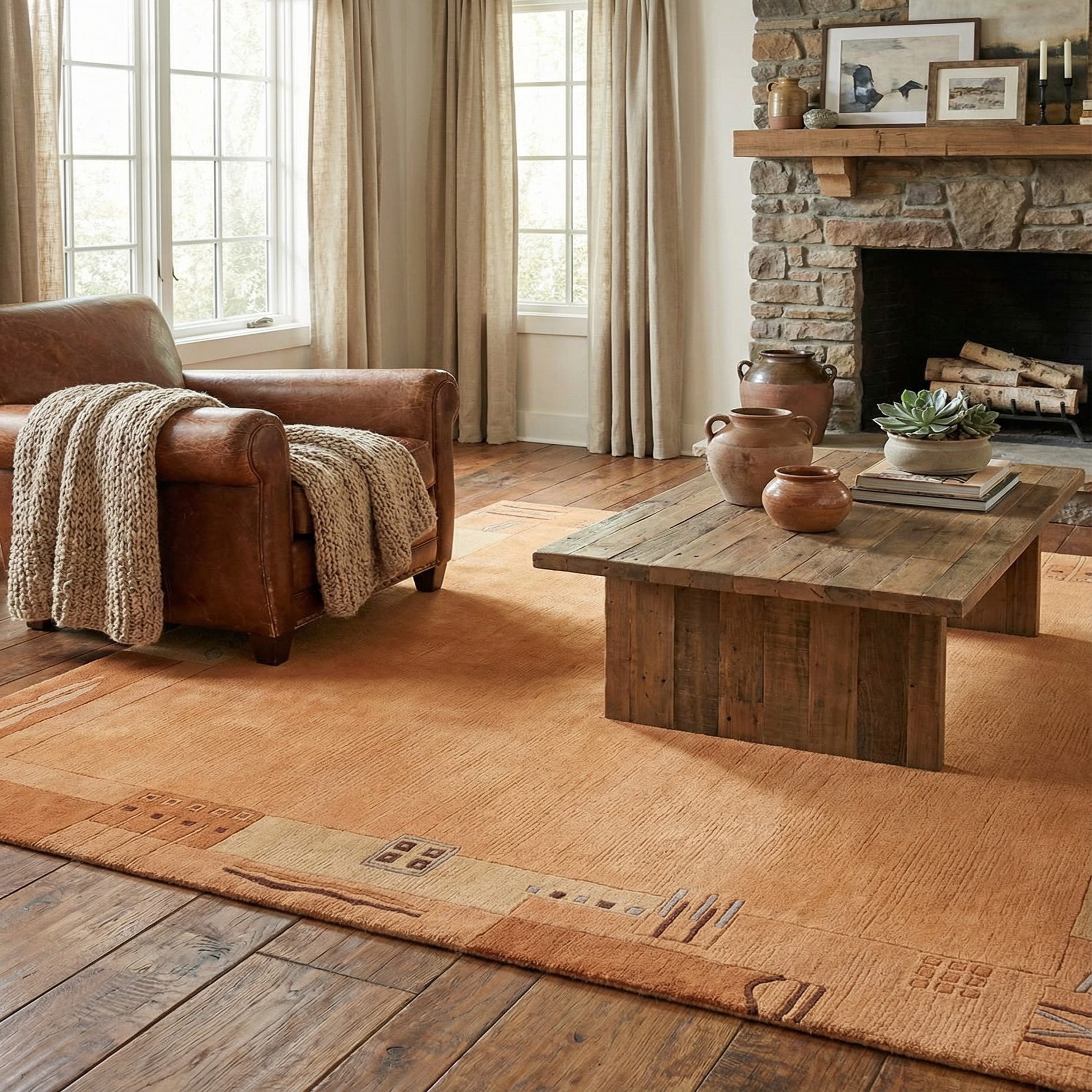 Primary color is Orange. Colors in this rug include: Orange, Beige, Burgundy, Cream.