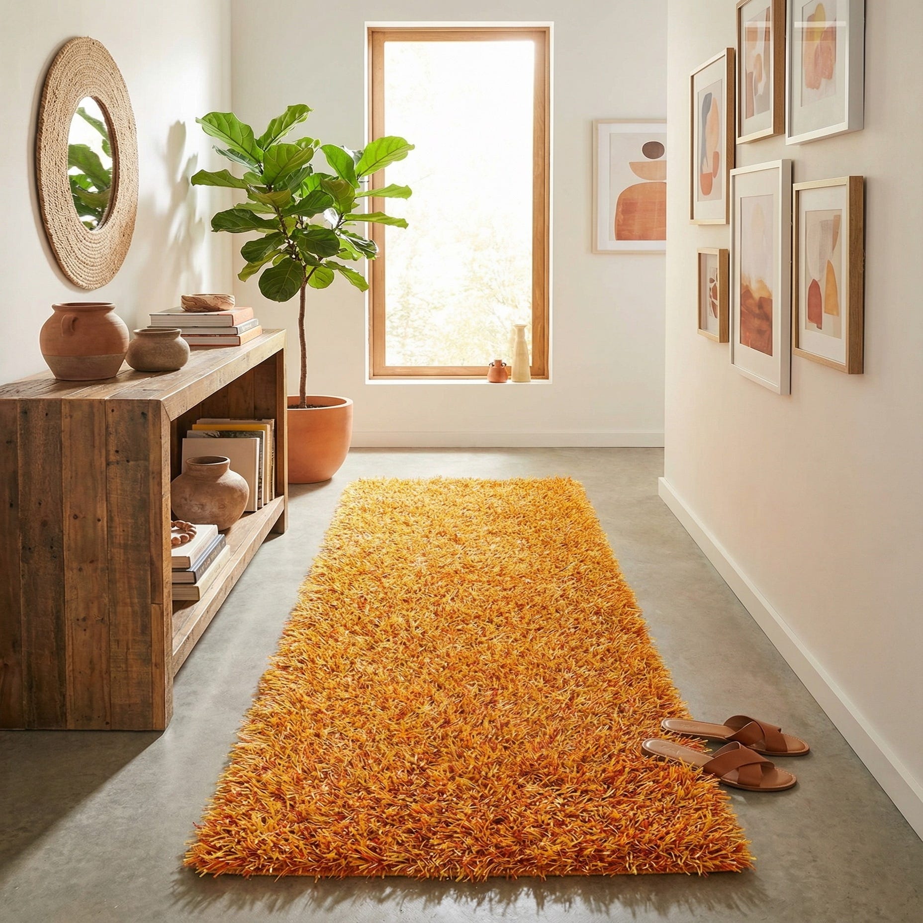 Primary color is Orange. Colors in this rug include: Orange, Yellow.