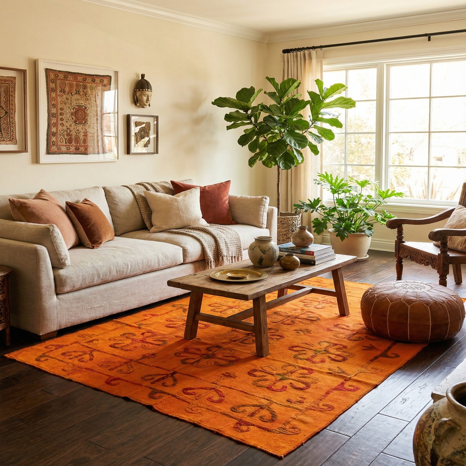 Primary color is Orange. Colors in this rug include: Orange, Brown, Red.