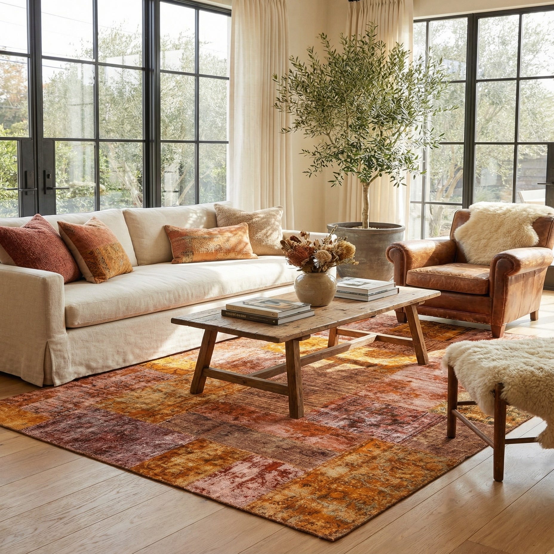 Primary color is Orange. Colors in this rug include: Orange, Brown, Rust Red, Terracotta, Yellow, Black.
