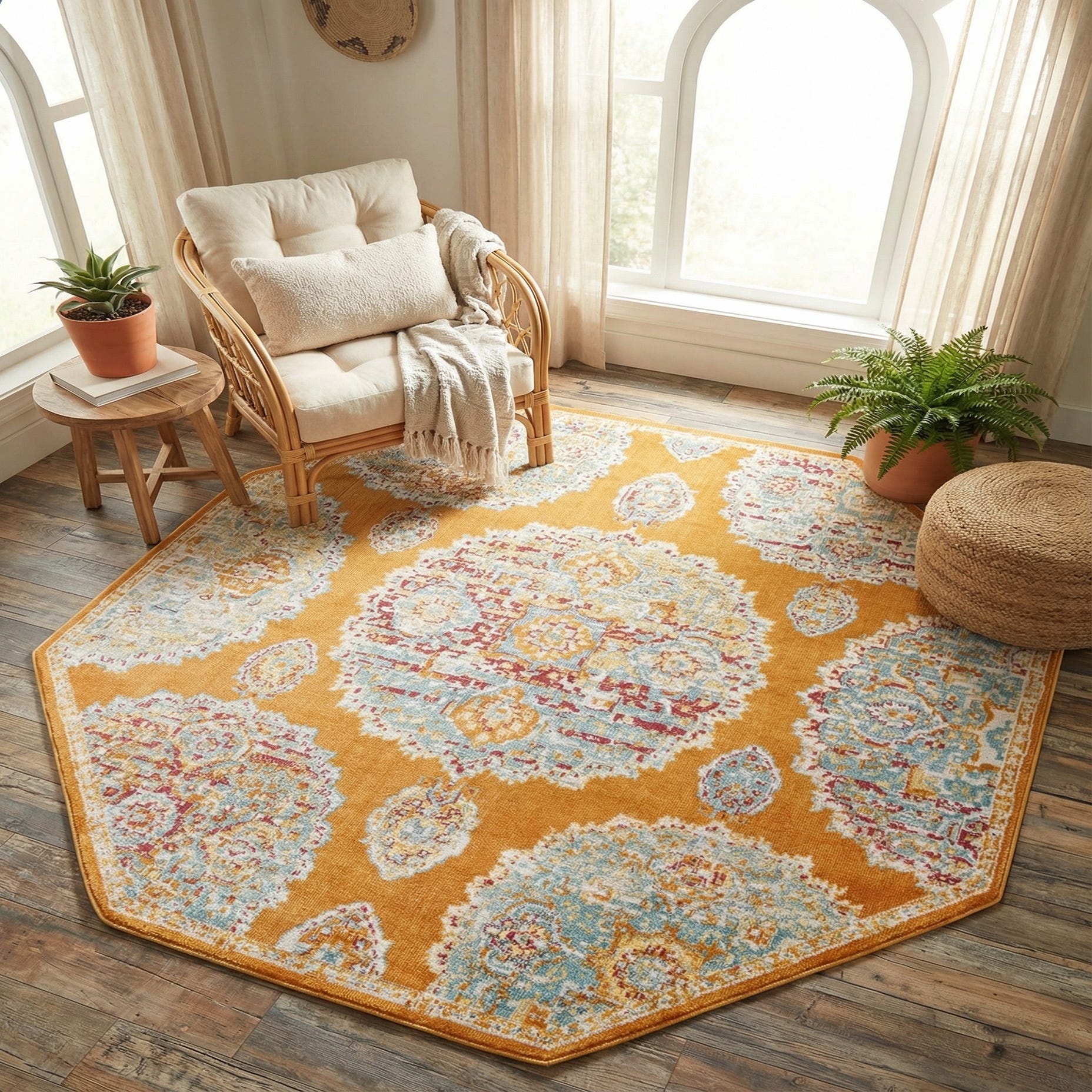 Primary color is Orange. Colors in this rug include: Orange, Blue, Ivory, Gray, Green, Yellow, Red.